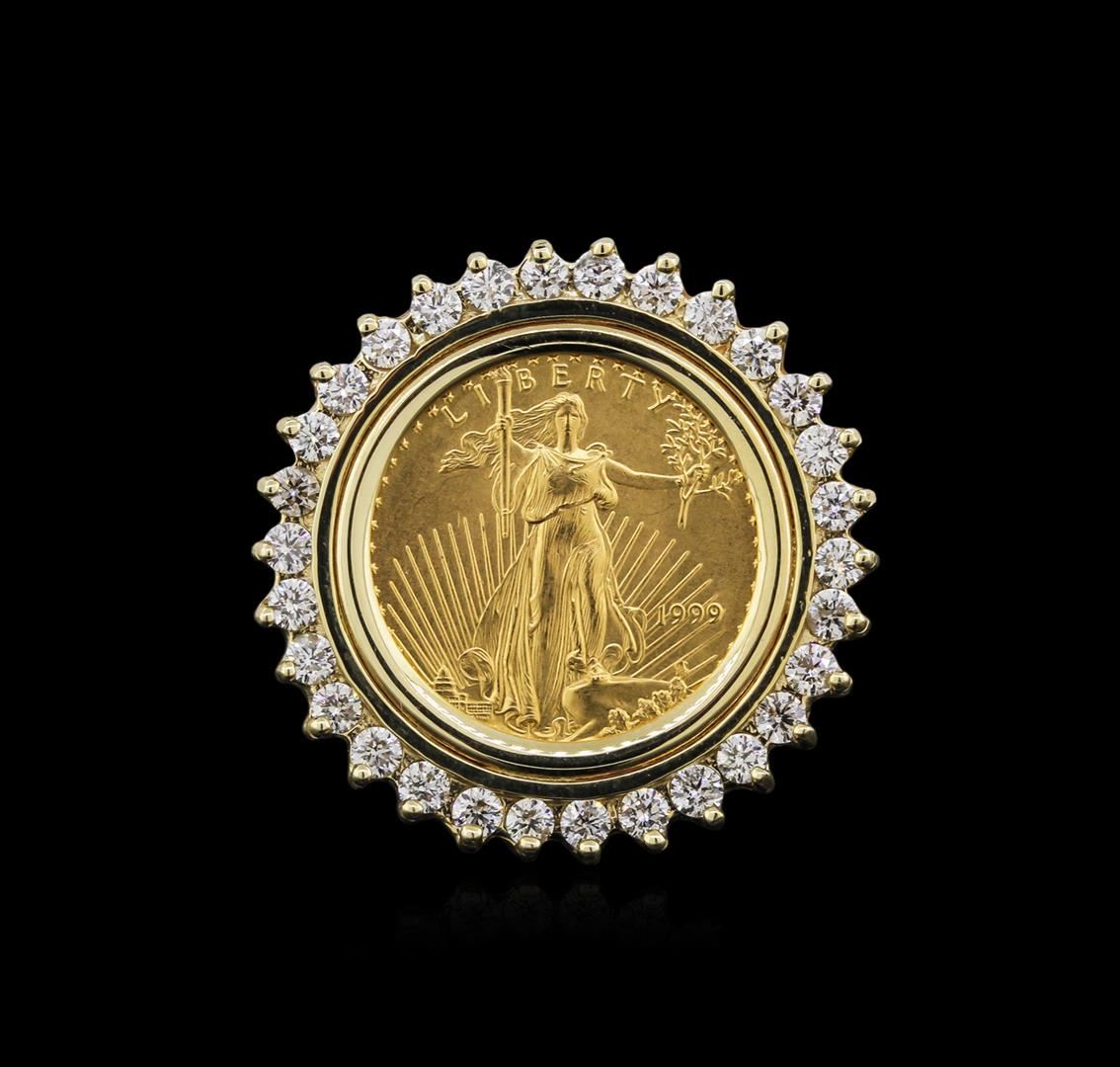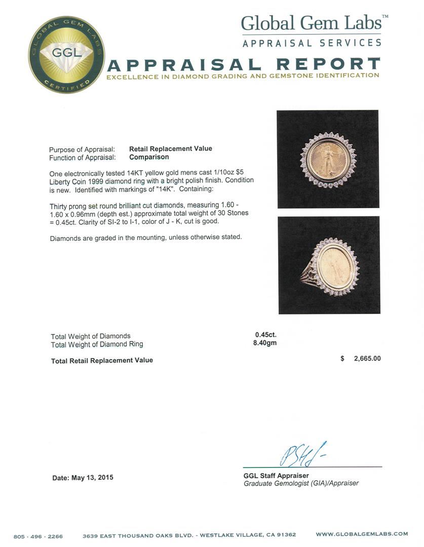 One electronically tested 14KT yellow gold mens cast 1/10oz $5 Liberty Coin 1999 diamond ring with a bright polish finish. Identified with markings of "14K". Condition is new. Containing: Thirty prong set round brilliant cut diamonds, measuring 1.60 - 1.60 x 0.96mm (depth est.) approximate total weight of 30 Stones = 0.45ct. Clarity: SI-2 to I-1. Color: J - K, Cut is Good. Diamonds are graded in the mounting, unless otherwise stated. Total Weight of Diamonds 0.45ct. Total Weight of Diamond Ring 8.40 grams. GGL Appraised at $2,665.00.