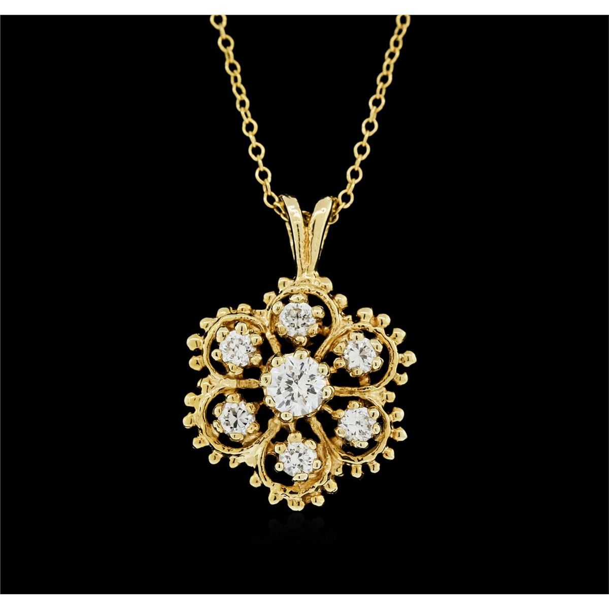 One pendant with chain featuring: 14KT yellow gold weighing 2.94 grams containing prong set round diamonds with a total weight of 0.45ct.