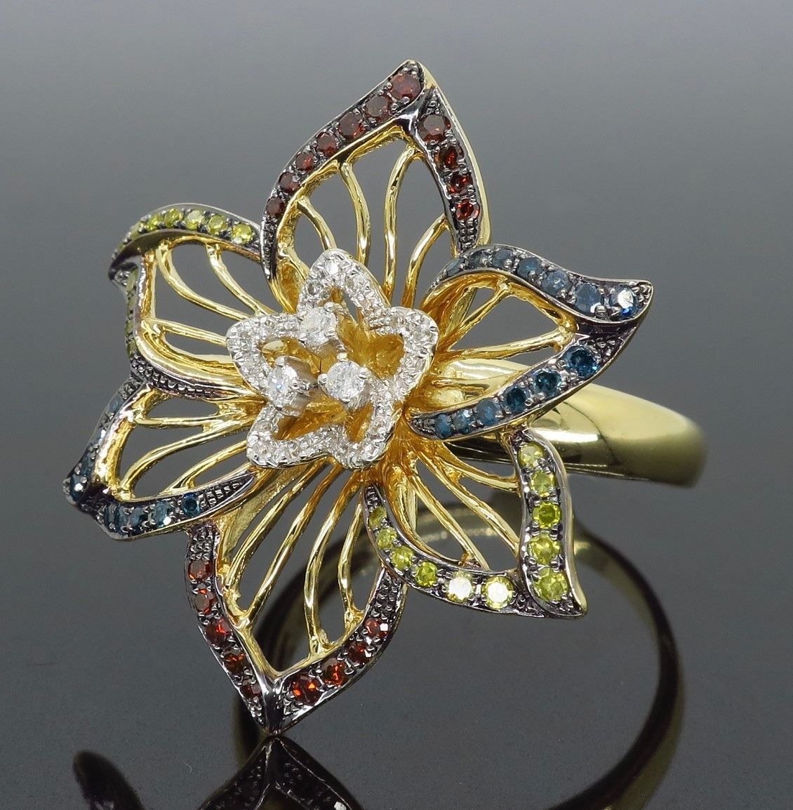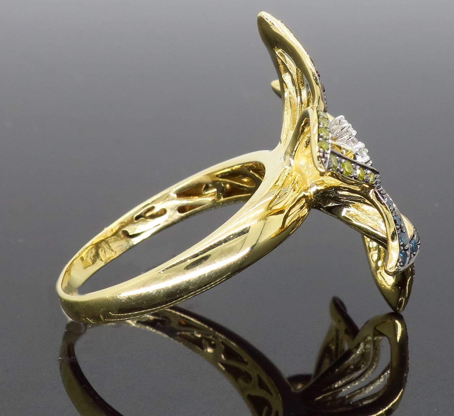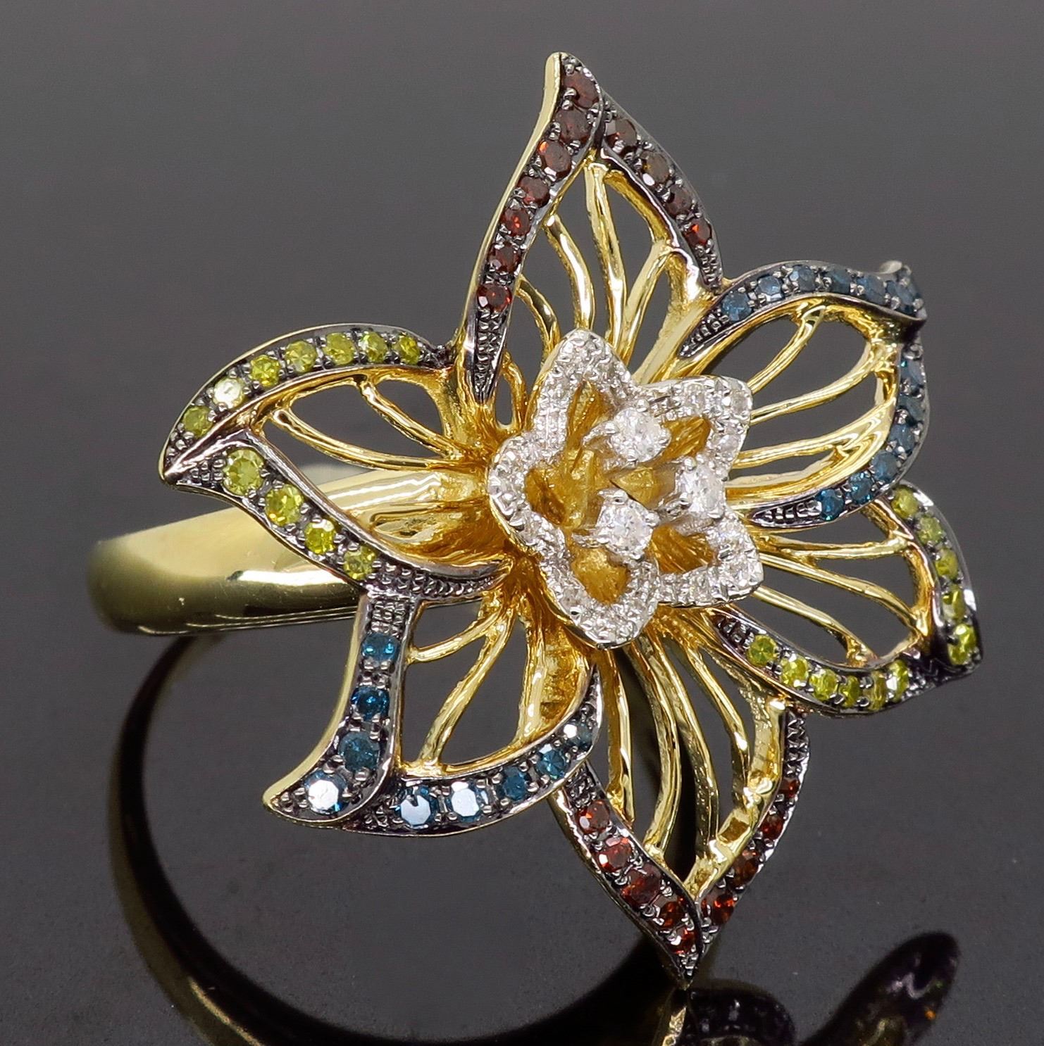 One 14KT Yellow Gold 0.45ctw Diamond Ring. (22) Yellow Diamonds, (20) Blue Diamonds, 20 Reddish Orange Diamonds and (18) white diamonds with a total weight of 0.45cts with a color of G-I and clarity of I-1. Total weight of this ring is 6.6 grams. Ring size is 7.5.