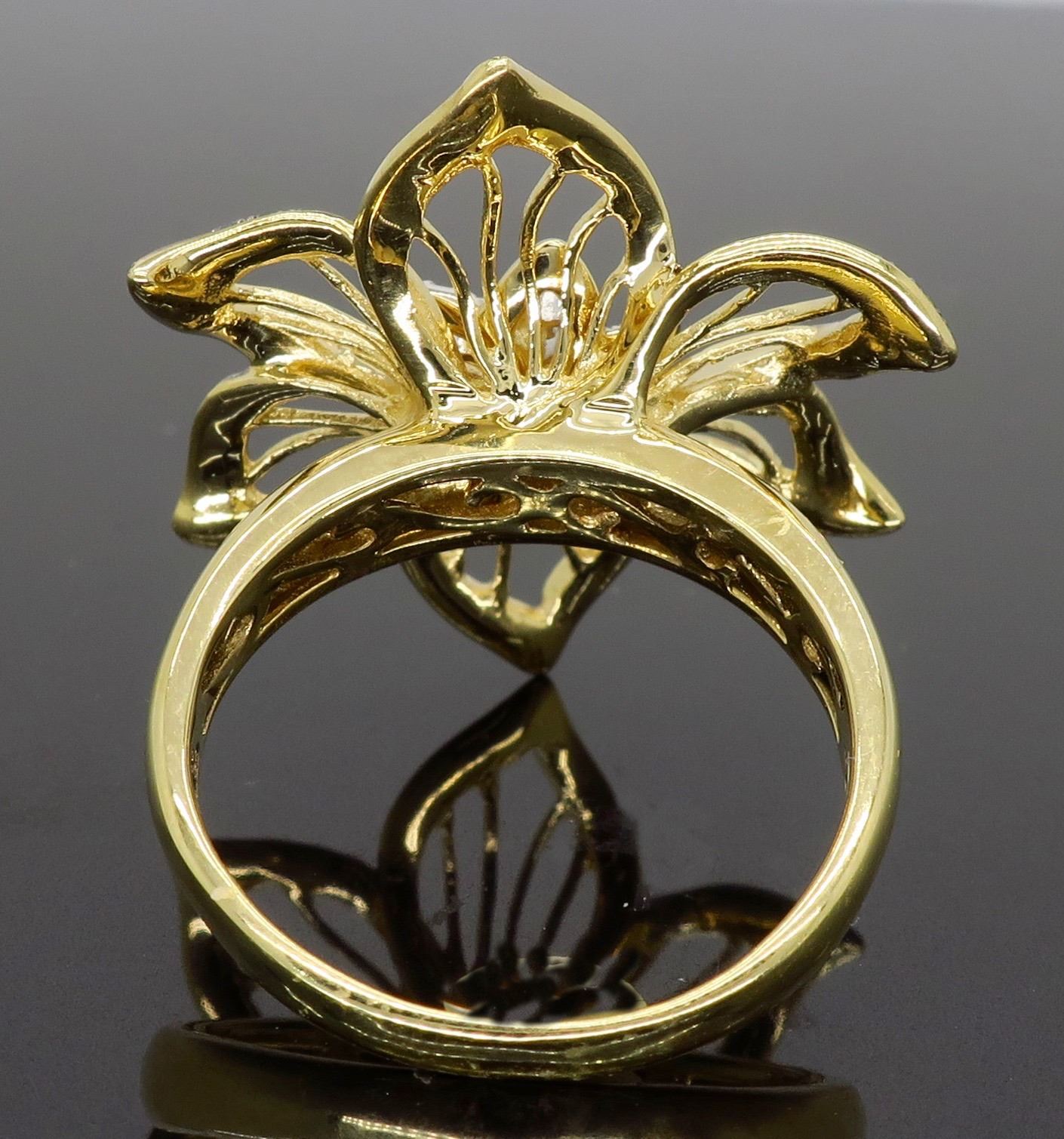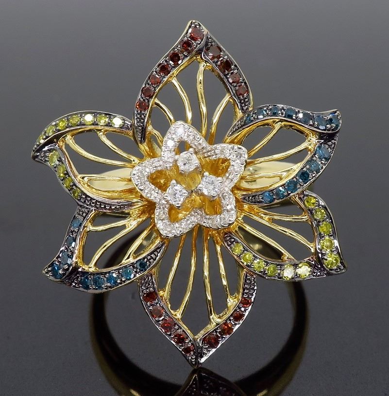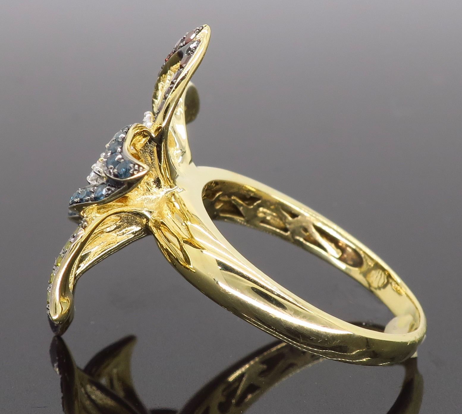 One 14KT Yellow Gold 0.45ctw Diamond Ring. (22) Yellow Diamonds, (20) Blue Diamonds, 20 Reddish Orange Diamonds and (18) white diamonds with a total weight of 0.45cts with a color of G-I and clarity of I-1. Total weight of this ring is 6.6 grams. Ring size is 7.5.