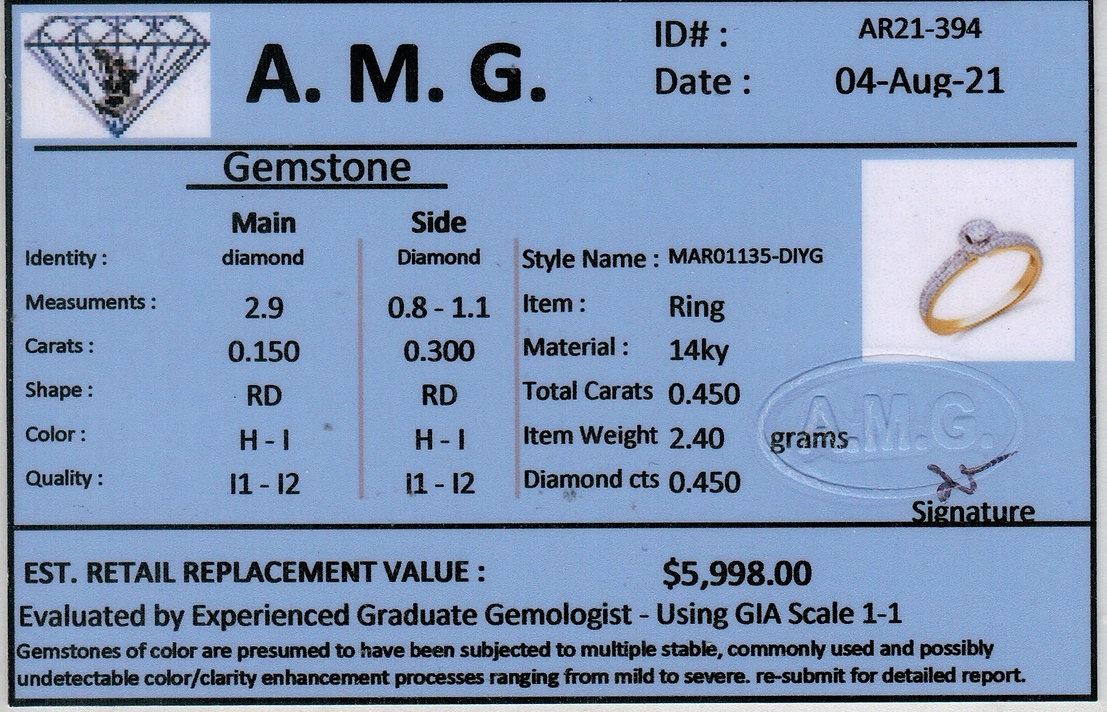 (1) round Diamond with a total weight of 0.15cts with a color of H-I and clarity of I1-I2. (68) round Diamonds with a total weight of 0.30cts with a color of H-I and clarity of I1-I2. Total weight of this ring is 2.4 grams. Ring size is 7.5.
