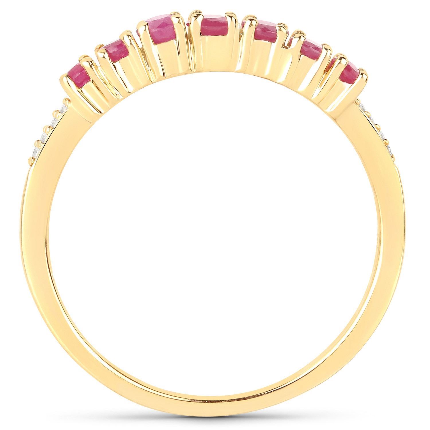 Ruby Round/2.60mm - 1/0.08 ctw Prong Setting Natural Heat Treated F + Ruby Round/2.40mm - 2/0.14 ctw Natural Heat Treated F + Ruby Round/2.20mm - 2/0.12 ctw Natural Heat Treated F + Ruby Round/2.00mm - 2/0.09 ctw Natural Heat Treated F + White Diamond Round/0.80mm - 8/0.02 ctw Natural Not Treated N H-I I1. Ring size 7. Total weight of 1.83 grams.