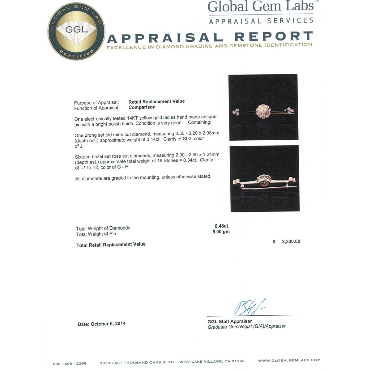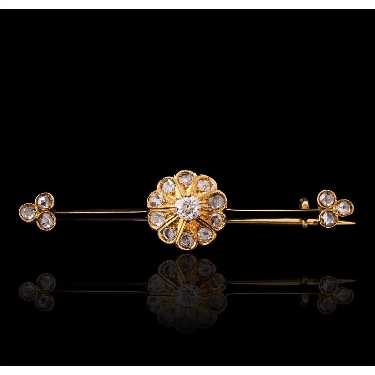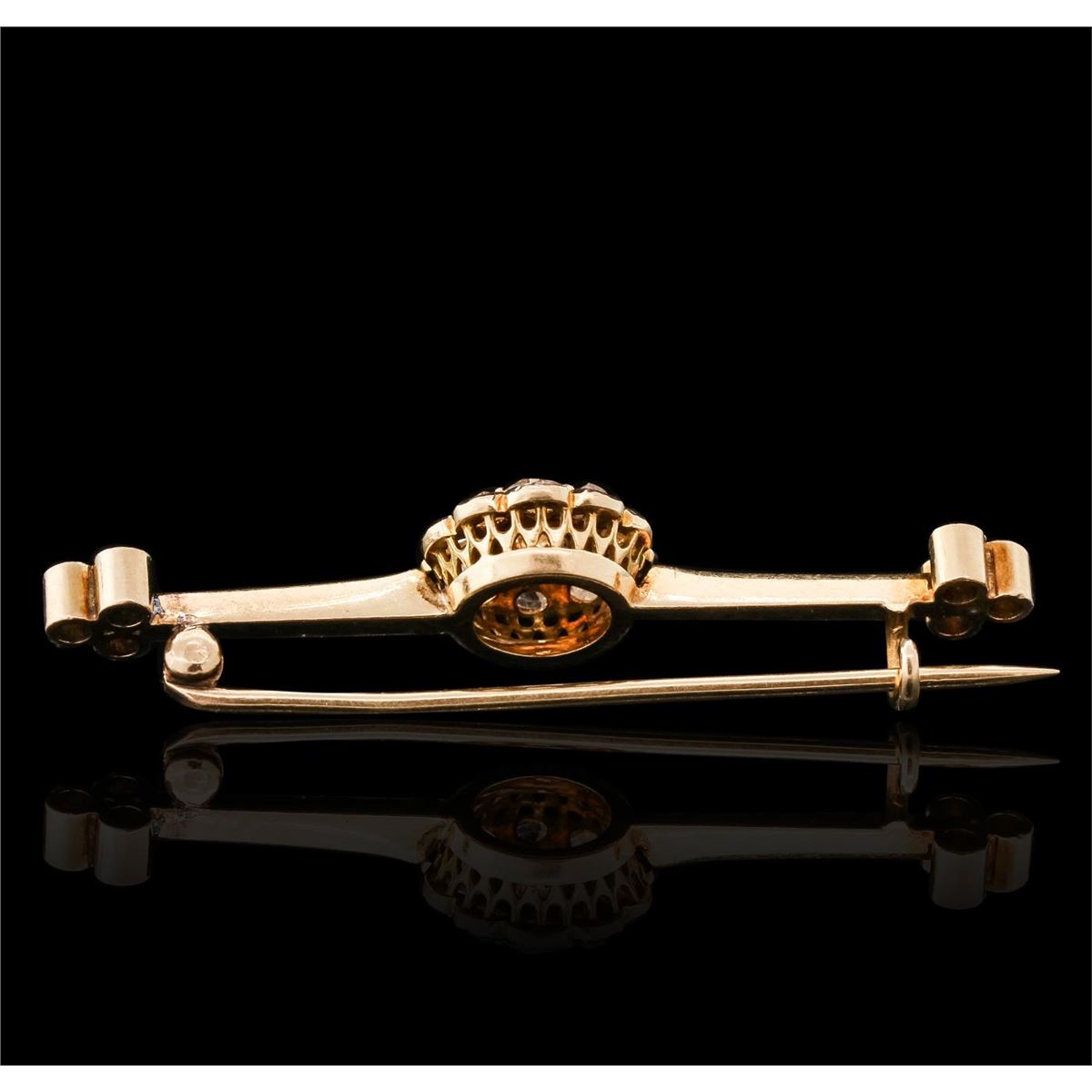One electronically tested 14KT yellow gold ladies hand made antique pin with a bright polish finish. Condition is very good. Containing: One prong set old mine cut diamond, measuring 3.50 - 3.20 x 2.08mm (depth est.) approximate weight of 0.14ct. Clarity: SI-2. Color: J. Sixteen bezel set rose cut diamonds, measuring 2.00 - 2.00 x 1.24mm (depth est.) approximate total weight of 16 Stones = 0.34ct. Clarity: I-1 to I-2. Color: G - H. All diamonds are graded in the mounting, unless otherwise stated. Total Weight of Diamonds 0.48ct. Total Weight of Pin 5.00 grams. GGL Appraised at $2,330.00.