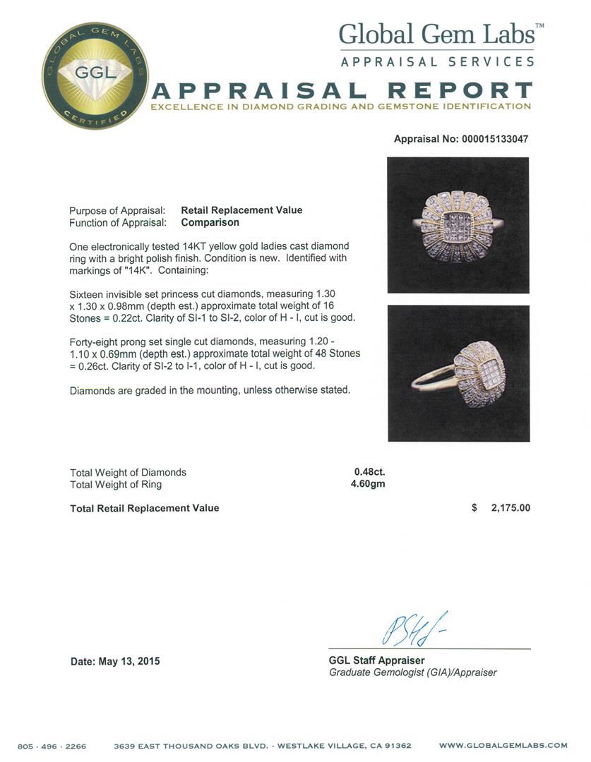 One electronically tested 14KT yellow gold ladies cast diamond ring with a bright polish finish. Identified with markings of "14K". Condition is new. Containing: Sixteen invisible set princess cut diamonds, measuring 1.30 x 1.30 x 0.98mm (depth est.) approximate total weight of 16 Stones = 0.22ct. Clarity: SI-1 to SI-2. Color: H - I, Cut is Good. Forty-Eight prong set single cut diamonds, measuring 1.20 - 1.10 x 0.69mm (depth est.) approximate total weight of 48 Stones = 0.26ct. Clarity: SI-2 to I-1. Color: H - I, Cut is Good. Diamonds are graded in the mounting, unless otherwise stated. Total Weight of Diamonds 0.48ct. Total Weight of Ring 4.60 grams. GGL Appraised at $2,175.00.