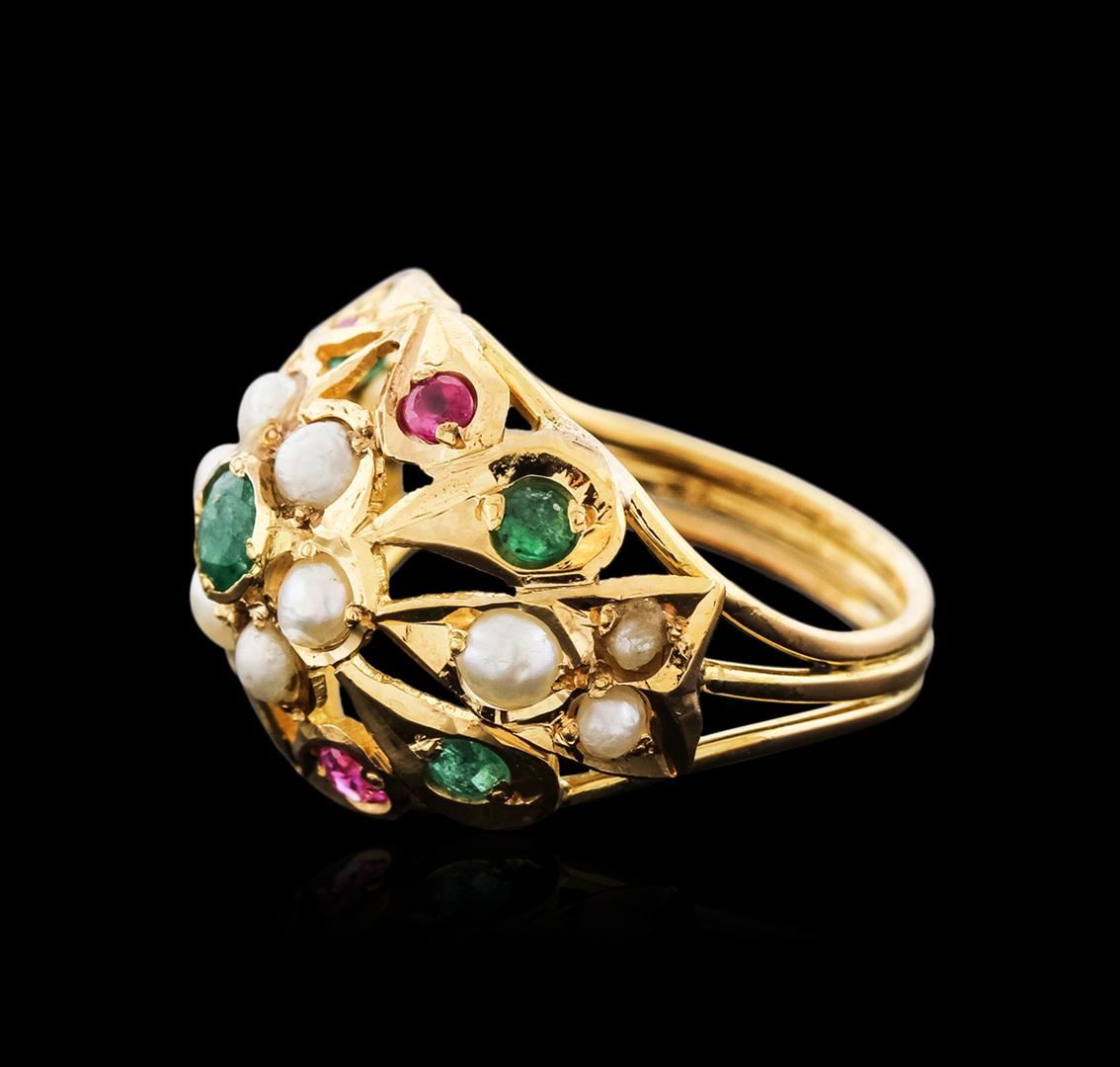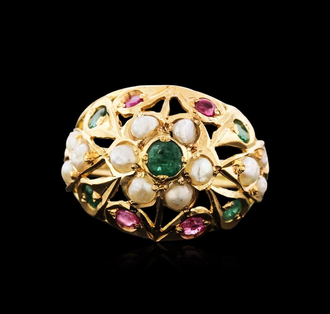 One ring featuring: 14KT yellow gold weighing 4.98 grams containing emeralds with a total weight of 0.50ct, rubies with a total weight of 0.24ct, and pearls.