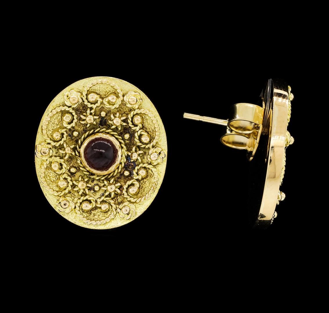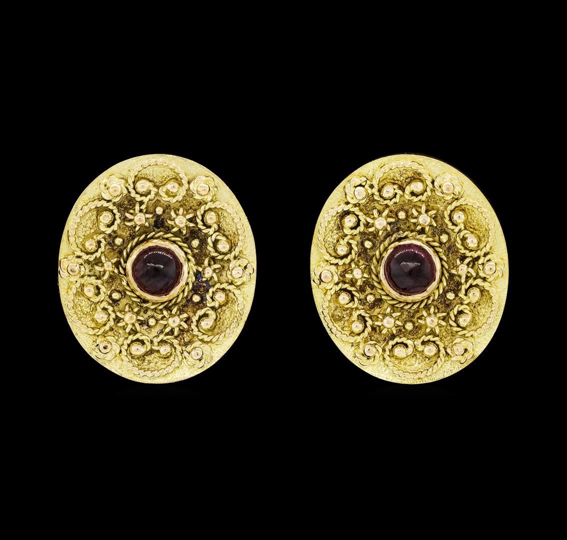One pair of ladys byzantine-style oval earrings with friction posts featuring: 14KT yellow gold weighing 13.4 grams containing garnet weighing 0.50ctw.