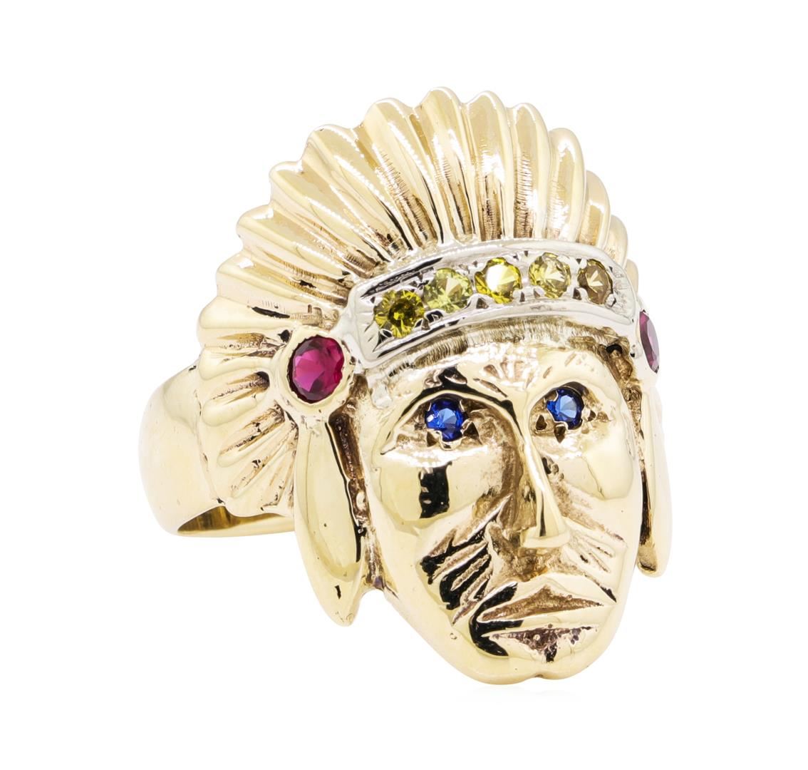 One Native American chief motif ring featuring: 14KT yellow gold weighing 9.8 grams containing blue, pink and yellow sapphires weighing 0.50ctw. The ring is a size 10.
