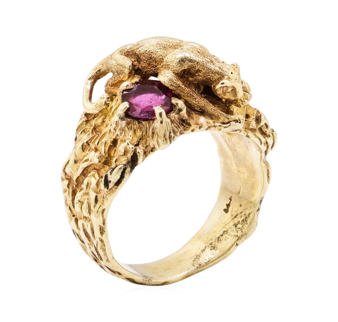 One panther ring featuring: 14KT yellow gold weighing 14.6 grams containing one round ruby weighing 0.50ct. The ring is a size 9.