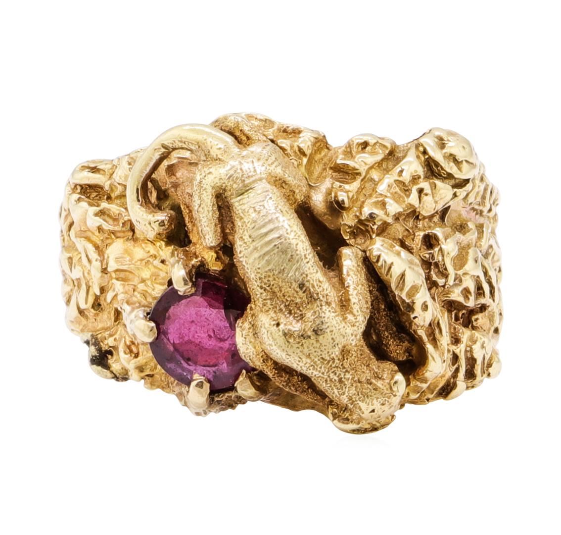One panther ring featuring: 14KT yellow gold weighing 14.6 grams containing one round ruby weighing 0.50ct. The ring is a size 9.