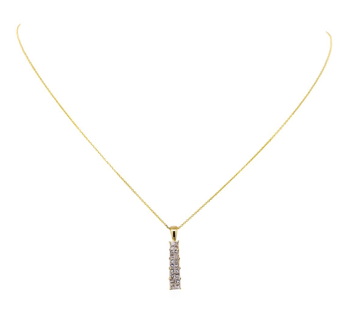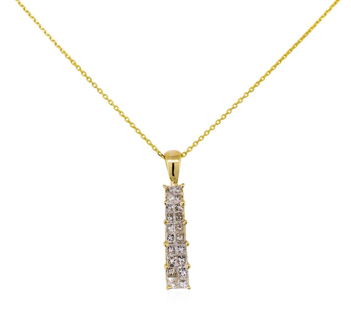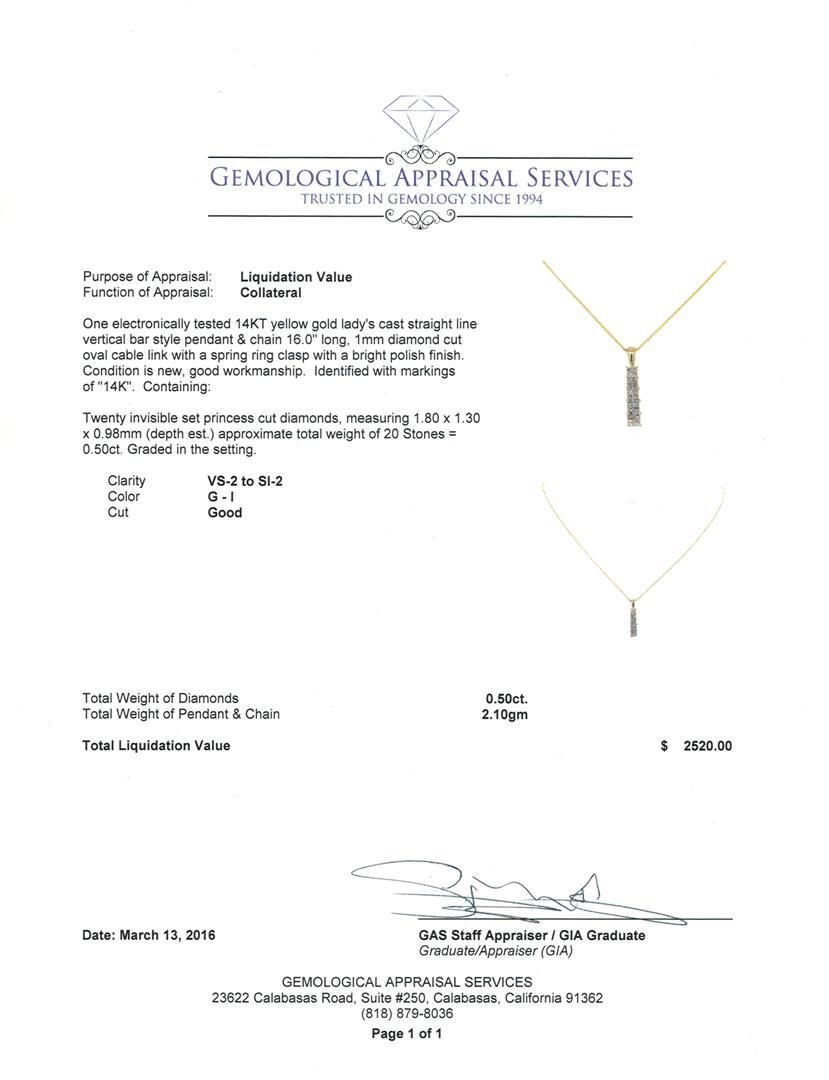 One electronically tested 14KT yellow gold lady's cast straight line vertical bar style pendant & chain 16.0" long, 1mm diamond cut oval cable link with a spring ring clasp with a bright polish finish. Identified with markings of "14K". Condition is new, good workmanship. Containing: Twenty invisible set princess cut diamonds, measuring 1.80 x 1.30 x 0.98mm (depth est.) approximate. Total Weight of 20 Stones = 0.50ct. Graded in the setting. Clarity: VS-2 to SI-2. Color: G - I, Cut Good. Total Weight of Diamonds 0.50ct. Total Weight of Pendant & Chain 2.10gm. GAS Appraised at $2,520.00.