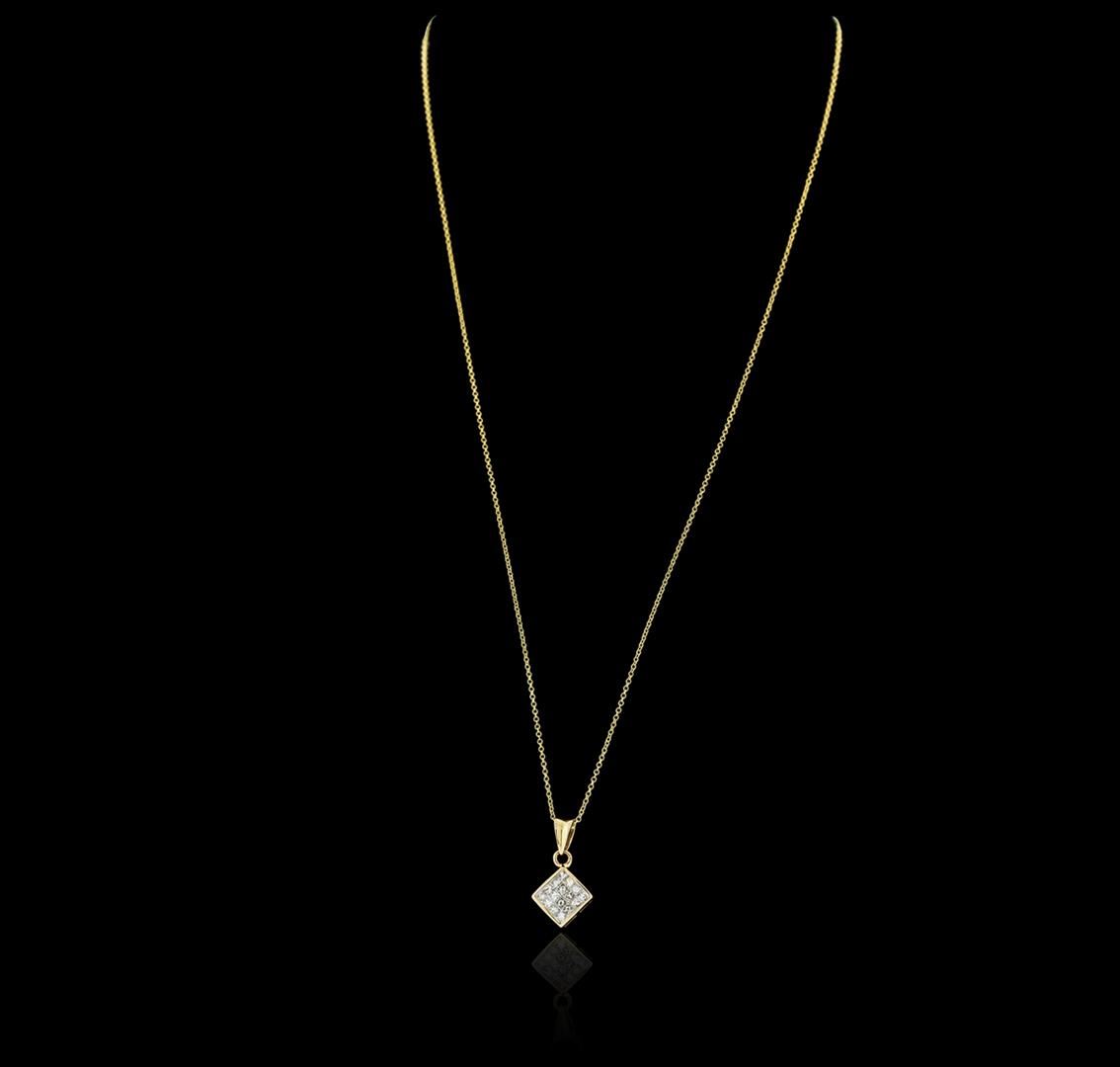 One pendant with chain featuring: 14KT yellow gold weighing 2.70 grams containing invisible set princess cut diamonds with a total weight of 0.50ct.