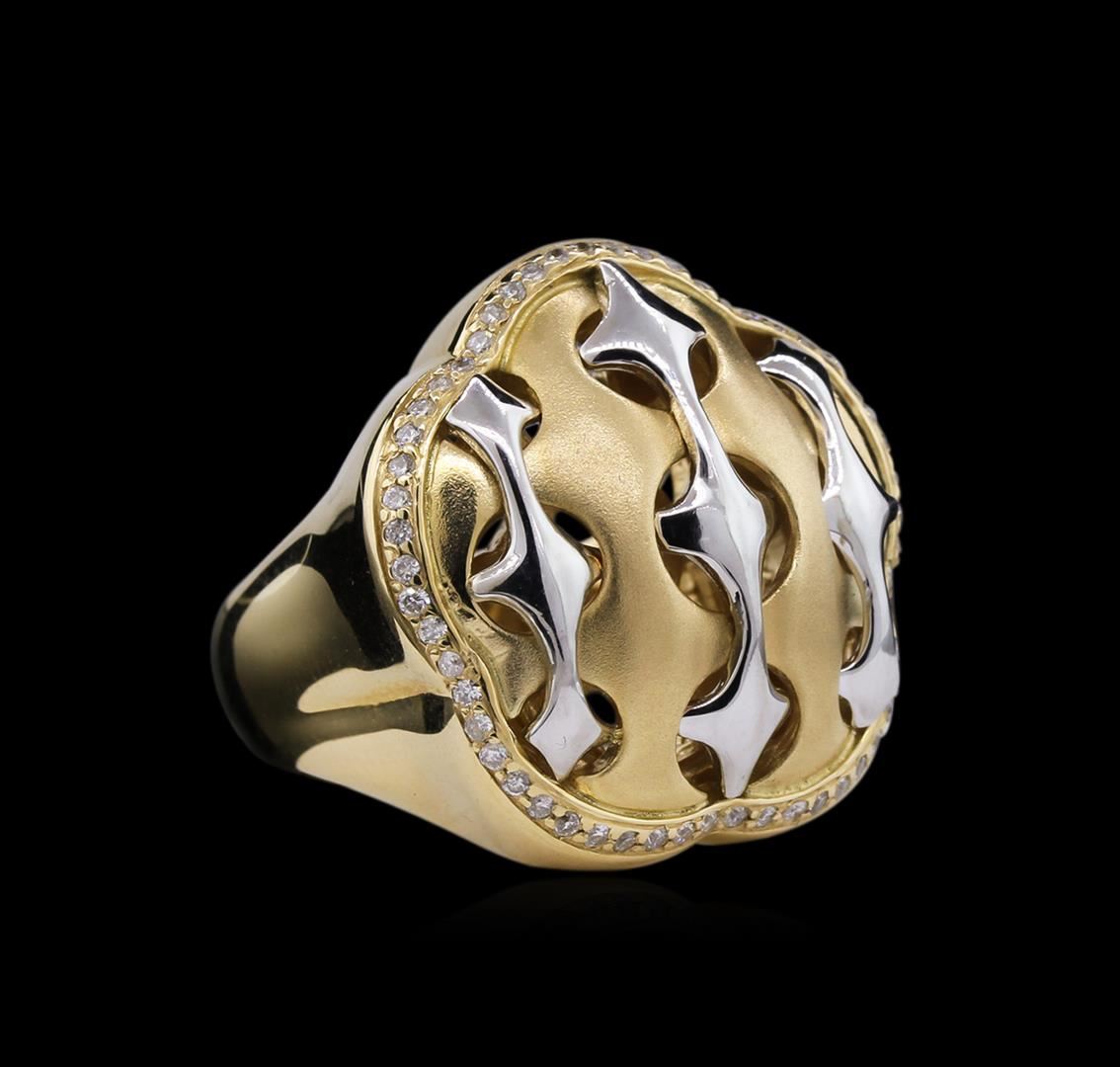 One electronically tested 14KT yellow gold Ladies die struck & assembled fancy ring with a bright polish finish. Identified with markings of "14K". Condition is excellent. Containing: Fifty-Four bead set round brilliant cut diamonds, measuring 1.20 - 1.20 x 0.72mm (depth est.) approximate total weight of 54 Stones = 0.50ct. Clarity of I-1 to I-2, Color of H - I. Total Weight of Diamonds 0.50ct. Total Weight of Rin 18.50gm. GGL Appraised at $4,846.00.