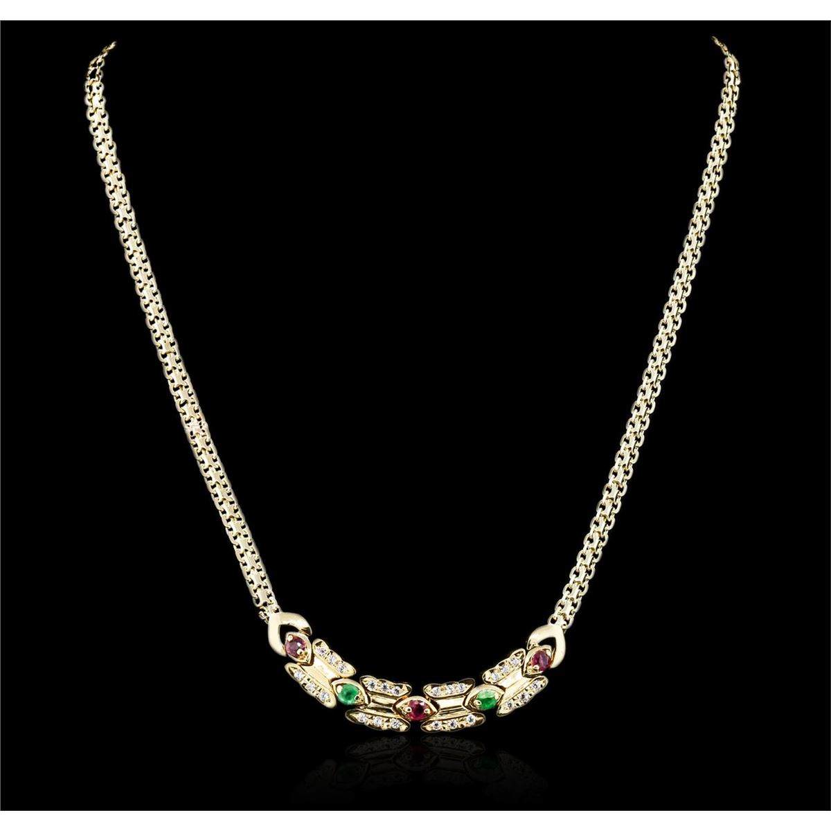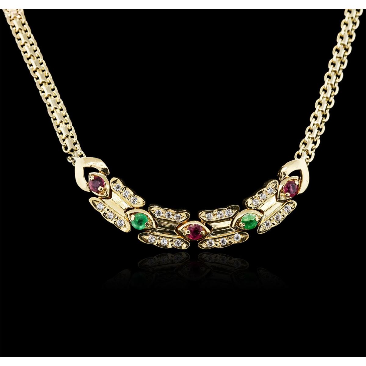 One necklace featuring: 14KT yellow gold weighing 19.40 grams containing three rubies with a total weight of 0.50cts, two emeralds with a total weight of 0.40cts, and round cut diamonds with a total weight of 0.50cts.