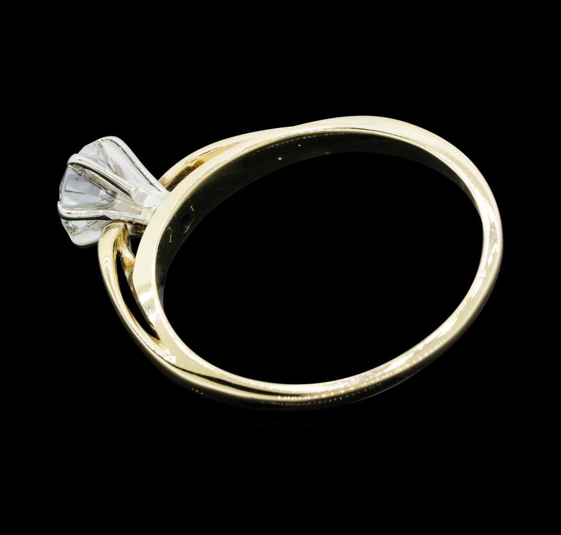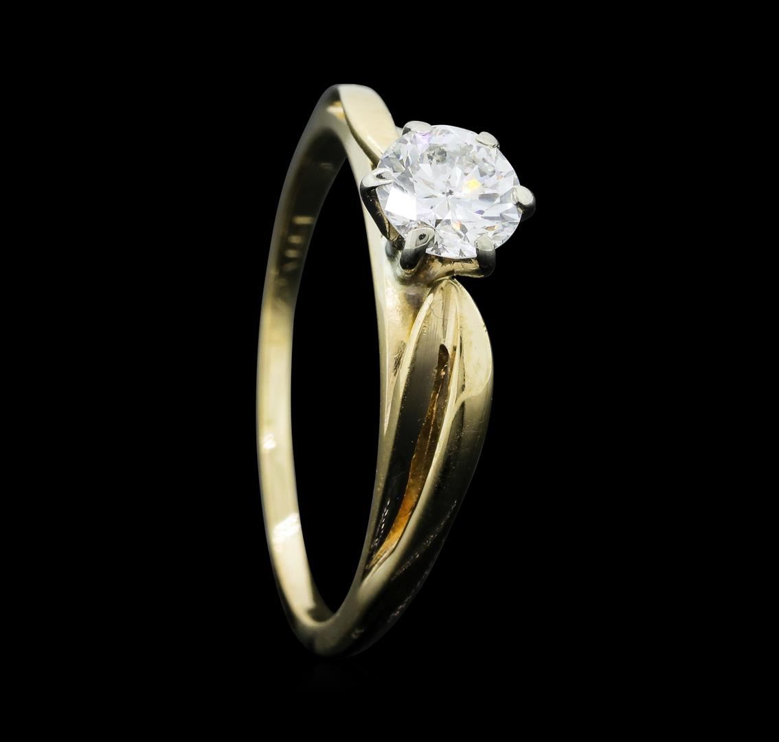 One electronically tested 14KT yellow gold lady's cast solitaire engagement ring with a crossover cathedral shank with a bright polish finish. The featured lady's ring has a shank measuring 1.02 millimeters wide. Identified with markings of "14K". Condition is like new, good workmanship. Containing: One prong set round brilliant cut diamond, measuring 5.15 - 5.05 x 3.16mm (depth est.) approximate weight of 0.51ct. Graded in the setting. Color HClarity SI-2 Cut Good. Total Weight of Diamonds 0.51ct. Total Weight of Ring 2.00gm. GAS Appraised.