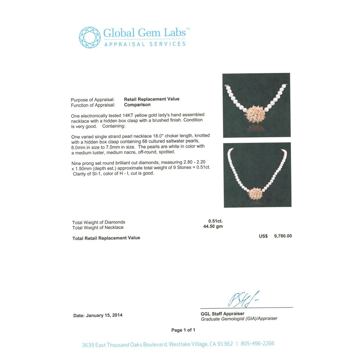 One electronically tested 14KT yellow gold Ladies hand assembled necklace with a hidden box clasp with a brushed finish. Condition is very good. Containing: One varied single strand pearl necklace 18.0 inch choker length, knotted with a hidden box clasp containing 68 cultured saltwater pearls, 6.0mm in size to 7.0mm in size. The pearls are white in color with a medium luster, medium nacre, off-round, spotted. Nine prong set round brilliant cut diamonds, measuring 2.80 - 2.20 x 1.50mm (depth est.) approximate total weight of 9 Stones = 0.51ct. Clarity of SI-1, Color of H - I, Cut is Good. Total Weight of Diamonds 0.51ct. Total Weight of Necklace 44.50gm. GGL Appraised at $9,780.00.