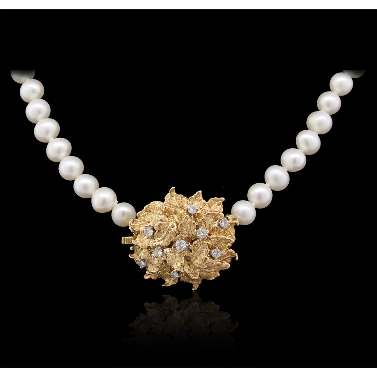 One electronically tested 14KT yellow gold Ladies hand assembled necklace with a hidden box clasp with a brushed finish. Condition is very good. Containing: One varied single strand pearl necklace 18.0 inch choker length, knotted with a hidden box clasp containing 68 cultured saltwater pearls, 6.0mm in size to 7.0mm in size. The pearls are white in color with a medium luster, medium nacre, off-round, spotted. Nine prong set round brilliant cut diamonds, measuring 2.80 - 2.20 x 1.50mm (depth est.) approximate total weight of 9 Stones = 0.51ct. Clarity of SI-1, Color of H - I, Cut is Good. Total Weight of Diamonds 0.51ct. Total Weight of Necklace 44.50gm. GGL Appraised at $9,780.00.
