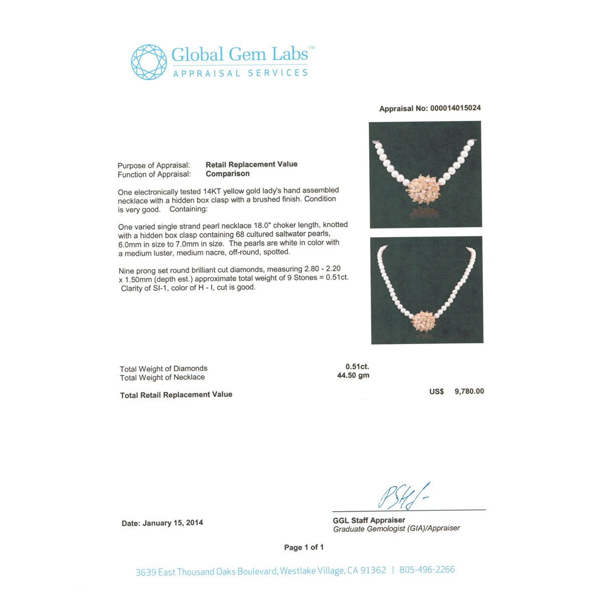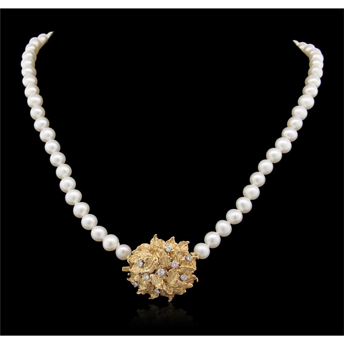 One electronically tested 14KT yellow gold Ladies hand assembled necklace with a hidden box clasp with a brushed finish. Condition is very good. Containing: One varied single strand pearl necklace 18.0 inch choker length, knotted with a hidden box clasp containing 68 cultured saltwater pearls, 6.0mm in size to 7.0mm in size. The pearls are white in color with a medium luster, medium nacre, off-round, spotted. Nine prong set round brilliant cut diamonds, measuring 2.80 - 2.20 x 1.50mm (depth est.) approximate total weight of 9 Stones = 0.51ct. Clarity of SI-1, Color of H - I, Cut is Good. Total Weight of Diamonds 0.51ct. Total Weight of Necklace 44.50gm. GGL Appraised at $9,780.00.