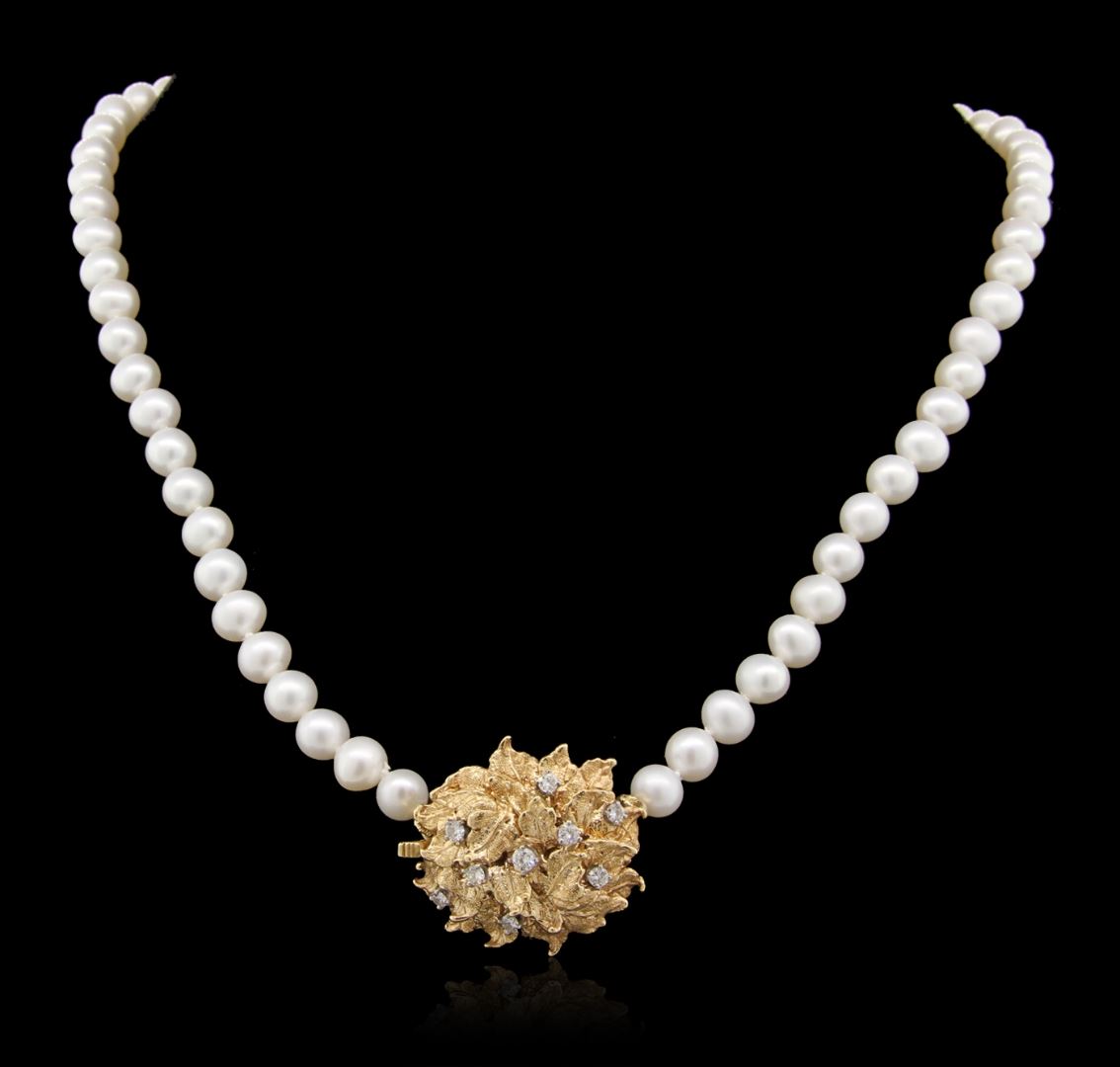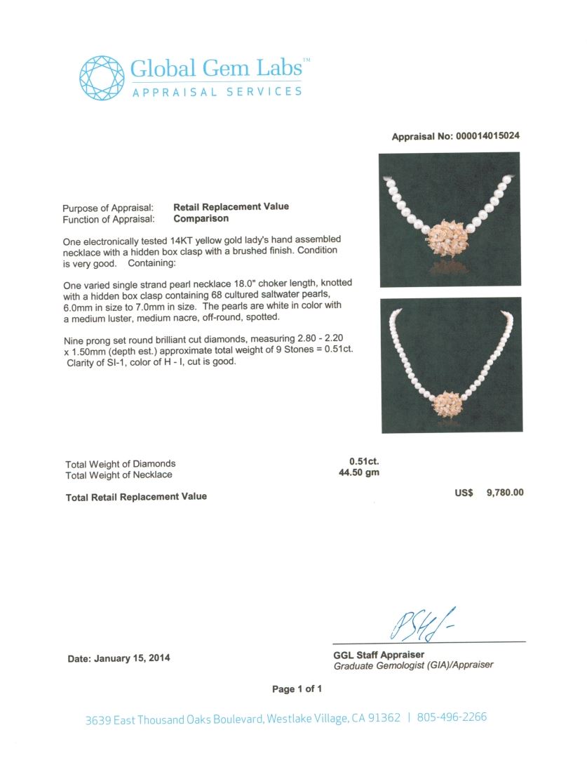 One electronically tested 14KT yellow gold Ladies hand assembled necklace with a hidden box clasp with a brushed finish. Condition is very good. Containing: One varied single strand pearl necklace 18.0 inch choker length, knotted with a hidden box clasp containing 68 cultured saltwater pearls, 6.0mm in size to 7.0mm in size. The pearls are white in color with a medium luster, medium nacre, off-round, spotted. Nine prong set round brilliant cut diamonds, measuring 2.80 - 2.20 x 1.50mm (depth est.) approximate total weight of 9 Stones = 0.51ct. Clarity of SI-1, Color of H - I, Cut is Good. Total Weight of Diamonds 0.51ct. Total Weight of Necklace 44.50gm. GGL Appraised at $9,780.00.