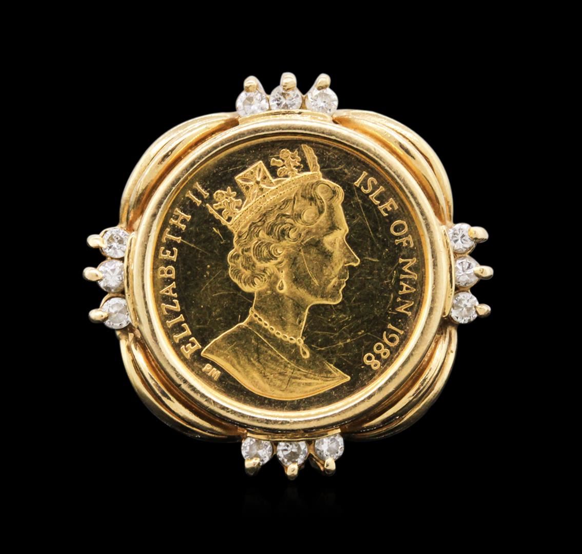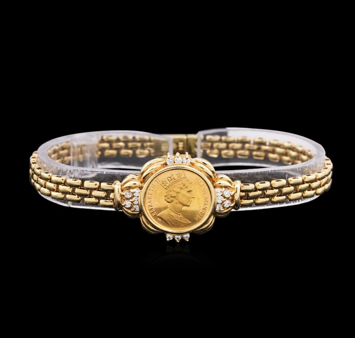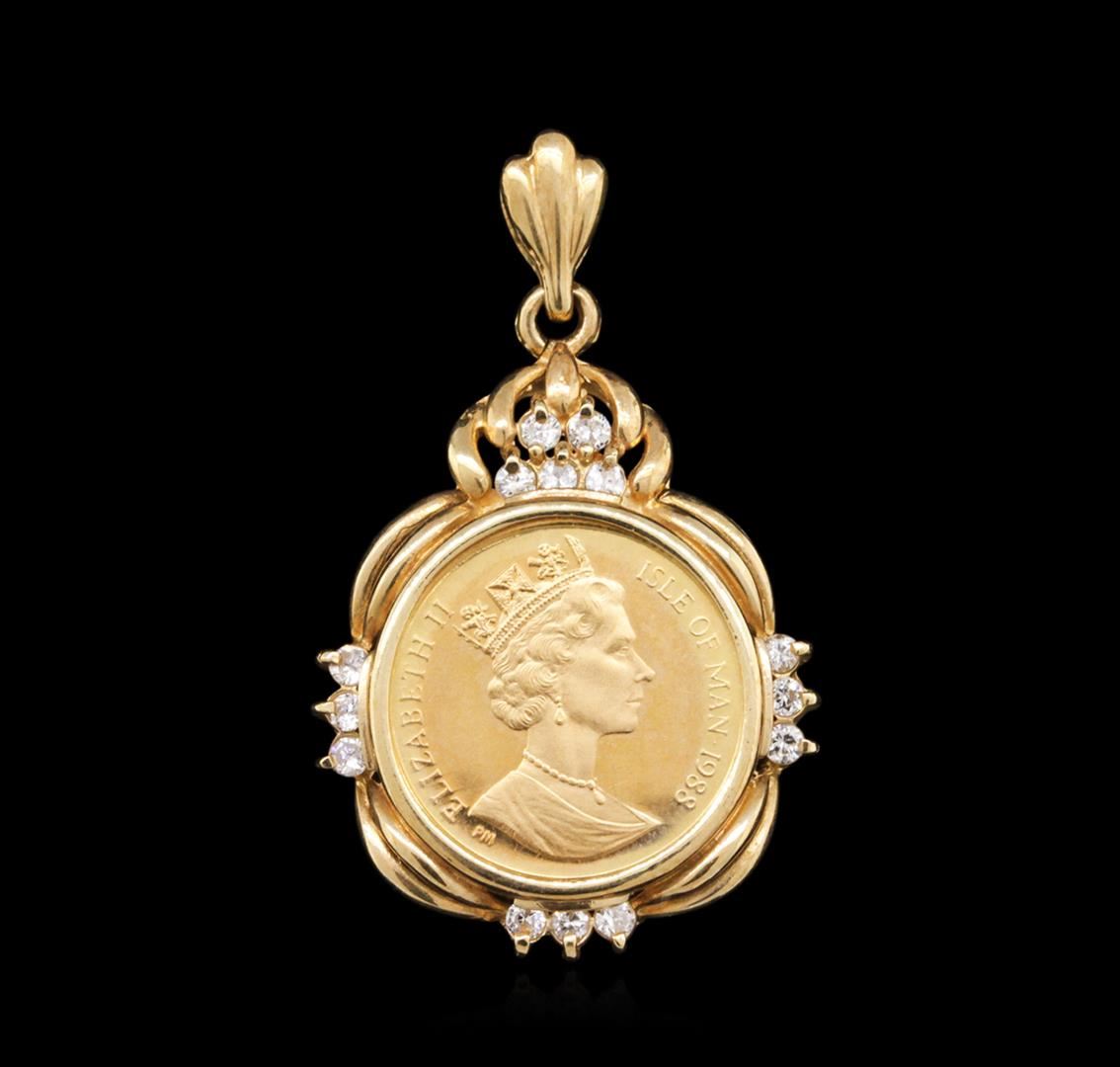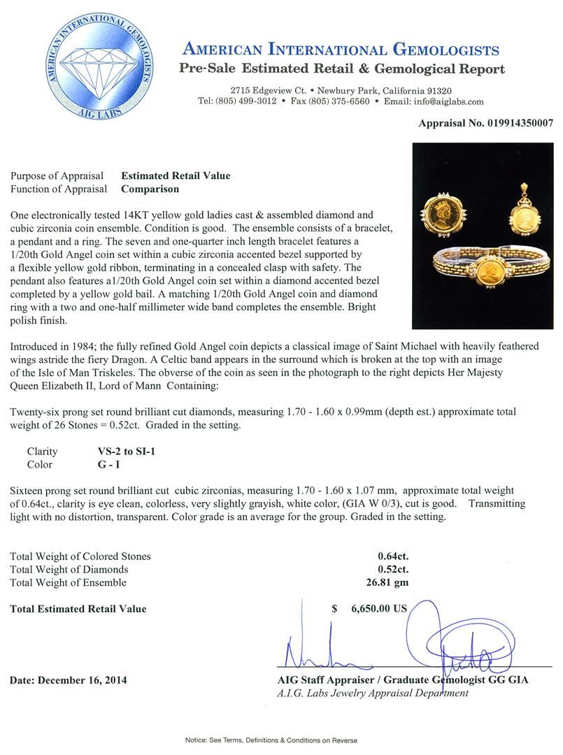 One electronically tested 14KT yellow gold ladies cast & assembled diamond and cubic zirconia coin ensemble. The ensemble consists of a bracelet, a pendant and a ring. The seven and one-quarter inch length bracelet features a 1/20th Gold Angel coin set within a cubic zirconia accented bezel supported by a flexible yellow gold ribbon, terminating in a concealed clasp with safety. The pendant also features a1/20th Gold Angel coin set within a diamond accented bezel completed by a yellow gold bail. A matching 1/20th Gold Angel coin and diamond ring with a two and one-half millimeter wide band completes the ensemble. Bright polish finish. Introduced in 1984; the fully refined Gold Angel coin depicts a classical image of Saint Michael with heavily feathered wings astride the fiery Dragon. A Celtic band appears in the surround which is broken at the top with an image of the Isle of Man Triskeles. The obverse of the coin as seen in the photograph to the right depicts Her Majesty Queen Elizabeth II, Lord of Mann Condition is good. Containing: Twenty-Six prong set round brilliant cut diamonds, measuring 1.70 - 1.60 x 0.99mm (depth est.) approximate total weight of 26 Stones = 0.52ct. Graded in the setting. Clarity: VS-2 to SI-1. Color: G - I. Sixteen prong set round brilliant cut cubic zirconias, measuring 1.70 - 1.60 x 1.07 mm, approximate total weight of 0.64ct., clarity is eye clean, colorless, very slightly grayish, white color, (GIA W 0/3), cut is good. Transmitting light with no distortion, transparent. Color grade is an average for the group. Graded in the setting. Total Weight of Colored Stones 0.64ct. Total Weight of Diamonds 0.52ct. Total Weight of Ensemble 26.81 grams. AIG Appraised at $6,650.00.