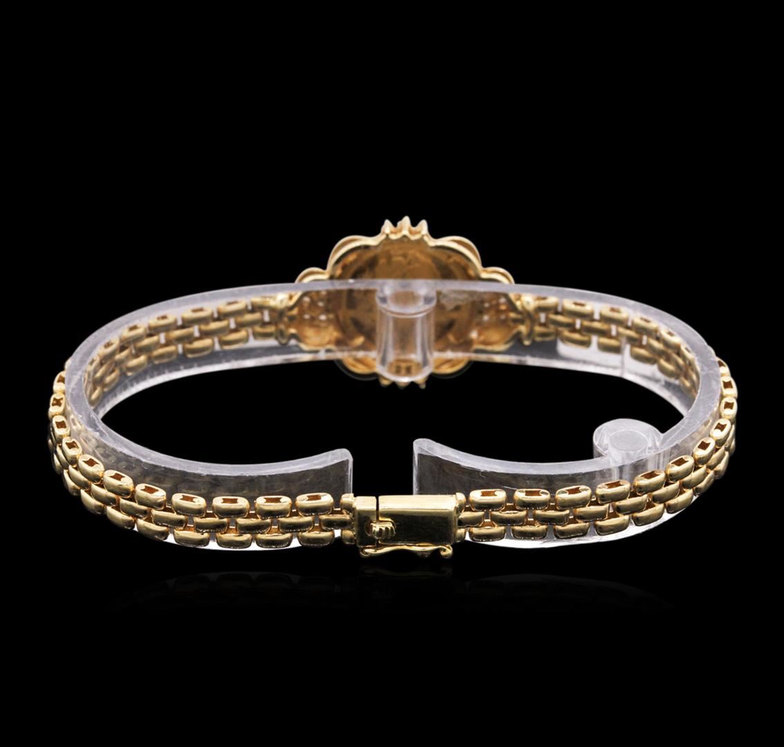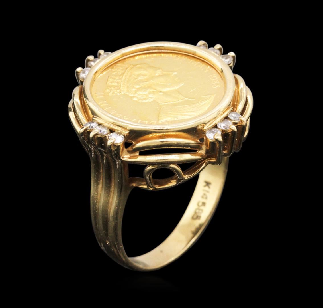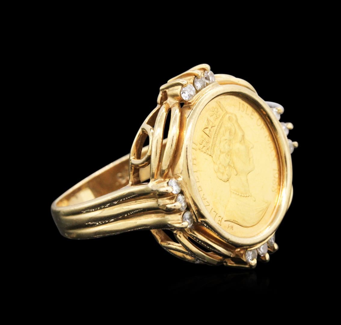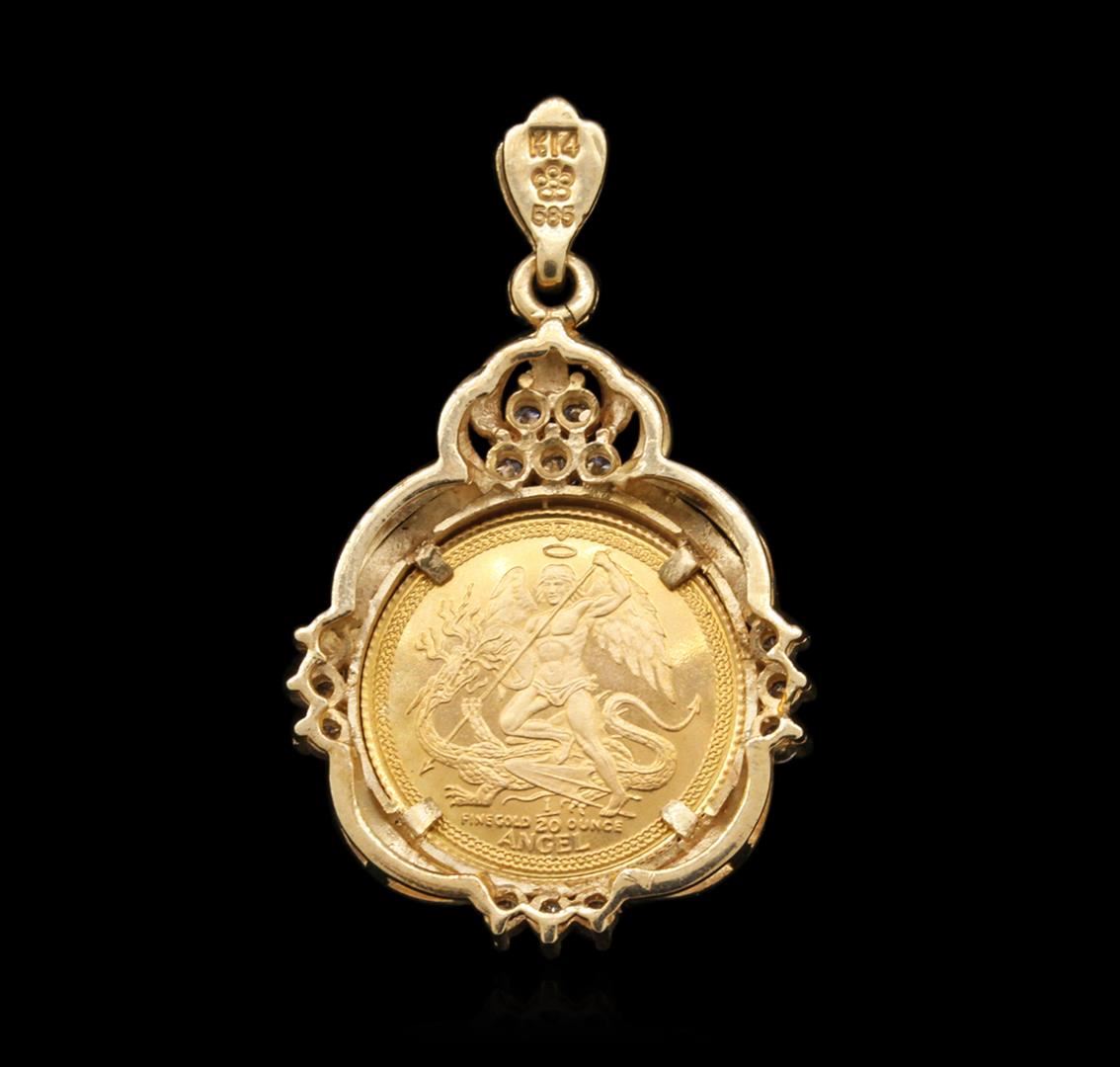 One electronically tested 14KT yellow gold ladies cast & assembled diamond and cubic zirconia coin ensemble. The ensemble consists of a bracelet, a pendant and a ring. The seven and one-quarter inch length bracelet features a 1/20th Gold Angel coin set within a cubic zirconia accented bezel supported by a flexible yellow gold ribbon, terminating in a concealed clasp with safety. The pendant also features a1/20th Gold Angel coin set within a diamond accented bezel completed by a yellow gold bail. A matching 1/20th Gold Angel coin and diamond ring with a two and one-half millimeter wide band completes the ensemble. Bright polish finish. Introduced in 1984; the fully refined Gold Angel coin depicts a classical image of Saint Michael with heavily feathered wings astride the fiery Dragon. A Celtic band appears in the surround which is broken at the top with an image of the Isle of Man Triskeles. The obverse of the coin as seen in the photograph to the right depicts Her Majesty Queen Elizabeth II, Lord of Mann Condition is good. Containing: Twenty-Six prong set round brilliant cut diamonds, measuring 1.70 - 1.60 x 0.99mm (depth est.) approximate total weight of 26 Stones = 0.52ct. Graded in the setting. Clarity: VS-2 to SI-1. Color: G - I. Sixteen prong set round brilliant cut cubic zirconias, measuring 1.70 - 1.60 x 1.07 mm, approximate total weight of 0.64ct., clarity is eye clean, colorless, very slightly grayish, white color, (GIA W 0/3), cut is good. Transmitting light with no distortion, transparent. Color grade is an average for the group. Graded in the setting. Total Weight of Colored Stones 0.64ct. Total Weight of Diamonds 0.52ct. Total Weight of Ensemble 26.81 grams. AIG Appraised at $6,650.00.
