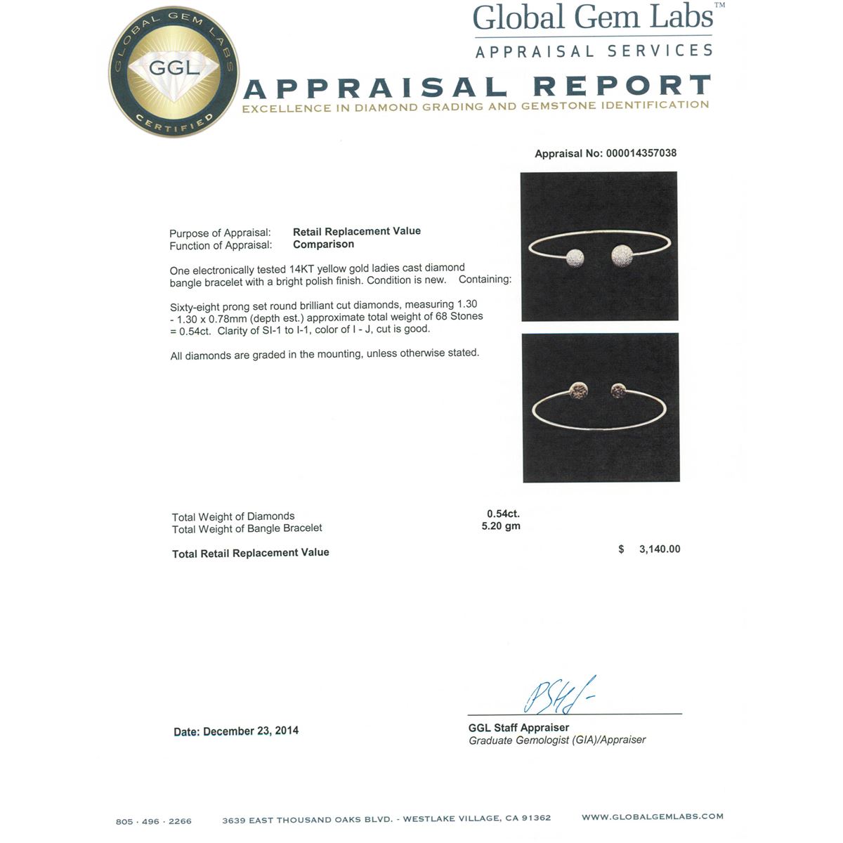 One electronically tested 14KT yellow gold ladies cast diamond bangle bracelet with a bright polish finish. Condition is new. Containing: Sixty-Eight prong set round brilliant cut diamonds, measuring 1.30 - 1.30 x 0.78mm (depth est.) approximate total weight of 68 Stones = 0.54ct. Clarity: SI-1 to I-1. Color: I - J, Cut is Good. All diamonds are graded in the mounting, unless otherwise stated. Total Weight of Diamonds 0.54ct. Total Weight of Bangle Bracelet 5.20 grams. GGL Appraised at $3,140.00.