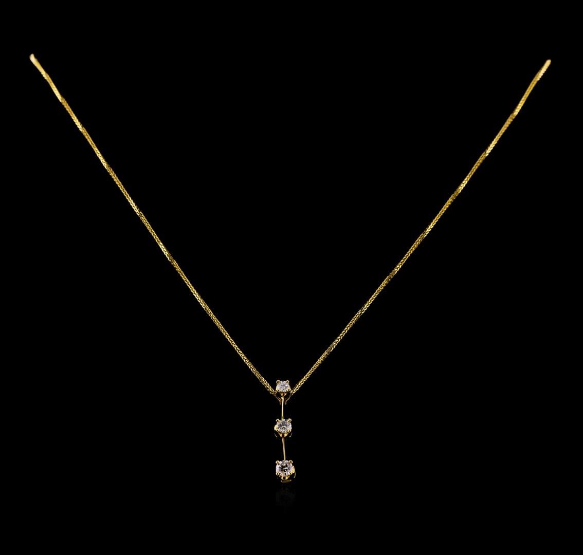 One electronically tested 14KT yellow gold ladies cast & assembled three diamond pendant with chain. The pendant is supported by an eighteen inch length 14KT yellow gold designer style chain, terminating in a lobster claw clasp. Bright polish finish. Trademark is KEEPSAKE. Identified with markings of "14K". Condition is new, good workmanship. Containing: One prong set round brilliant cut diamond, measuring 2.80 - 2.79 x 1.60mm (depth est.) approximate weight of 0.10ct. Graded in the setting. Clarity: I-1. Color: G. Depth 57.1%. Table 64.6%. One prong set round brilliant cut diamond, measuring 3.40 - 3.35 x 2.05mm (depth est.) approximate weight of 0.20ct. Graded in the setting. Clarity: I-1. Color: 60.7%. Table 65.1%. One prong set round brilliant cut diamond, measuring 3.65 - 3.60 x 2.30mm (depth est.) approximate weight of 0.25ct with a faint blue fluorescence. Graded in the setting. Clarity: SI-2. Color: 63.4%. Table 66.1%. Total Weight of Diamonds 0.55ct. Total Weight of Pendant With Chain 2.93 grams. AIG Appraised at $2,415.00.