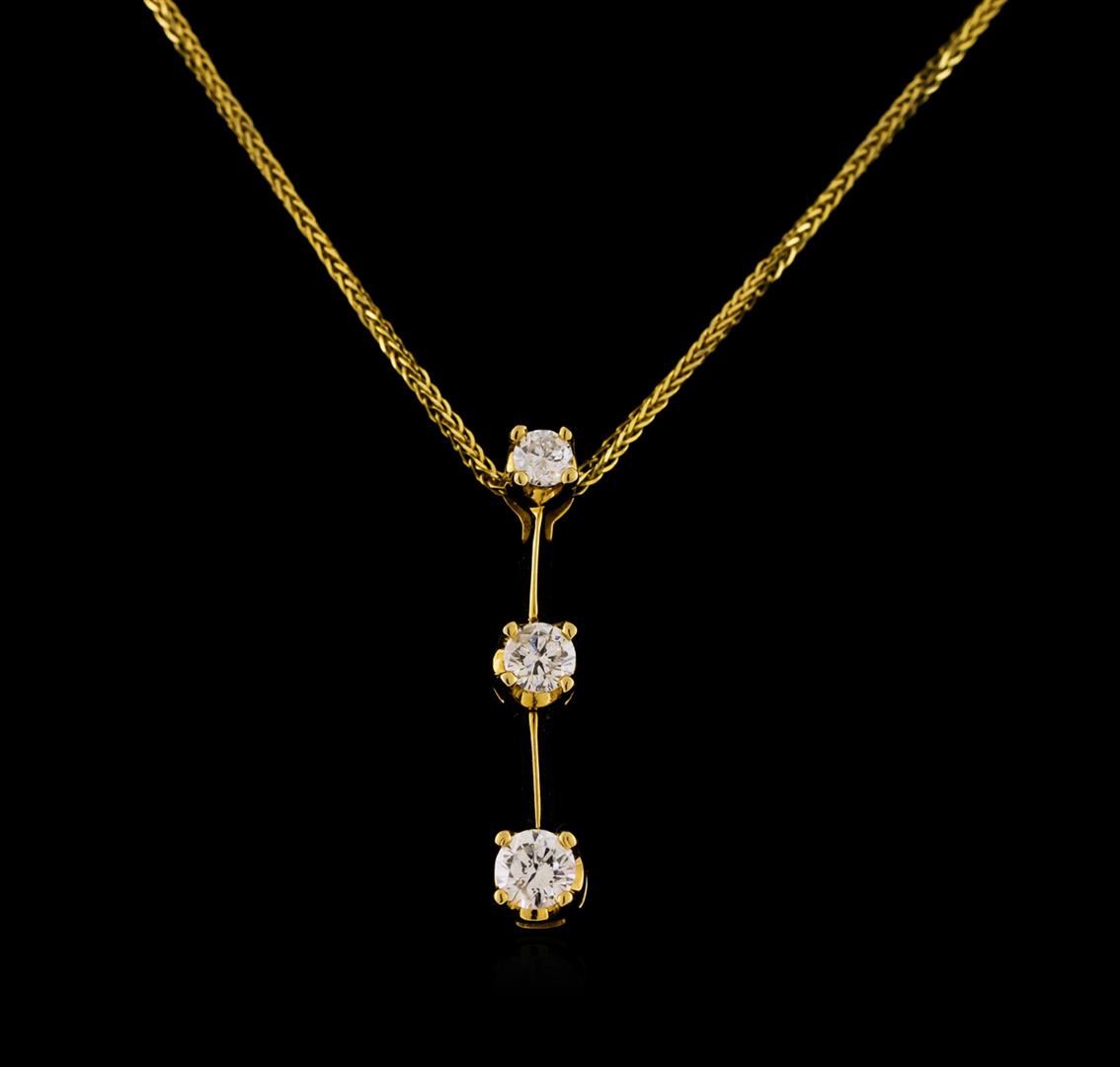 One electronically tested 14KT yellow gold ladies cast & assembled three diamond pendant with chain. The pendant is supported by an eighteen inch length 14KT yellow gold designer style chain, terminating in a lobster claw clasp. Bright polish finish. Trademark is KEEPSAKE. Identified with markings of "14K". Condition is new, good workmanship. Containing: One prong set round brilliant cut diamond, measuring 2.80 - 2.79 x 1.60mm (depth est.) approximate weight of 0.10ct. Graded in the setting. Clarity: I-1. Color: G. Depth 57.1%. Table 64.6%. One prong set round brilliant cut diamond, measuring 3.40 - 3.35 x 2.05mm (depth est.) approximate weight of 0.20ct. Graded in the setting. Clarity: I-1. Color: 60.7%. Table 65.1%. One prong set round brilliant cut diamond, measuring 3.65 - 3.60 x 2.30mm (depth est.) approximate weight of 0.25ct with a faint blue fluorescence. Graded in the setting. Clarity: SI-2. Color: 63.4%. Table 66.1%. Total Weight of Diamonds 0.55ct. Total Weight of Pendant With Chain 2.93 grams. AIG Appraised at $2,415.00.
