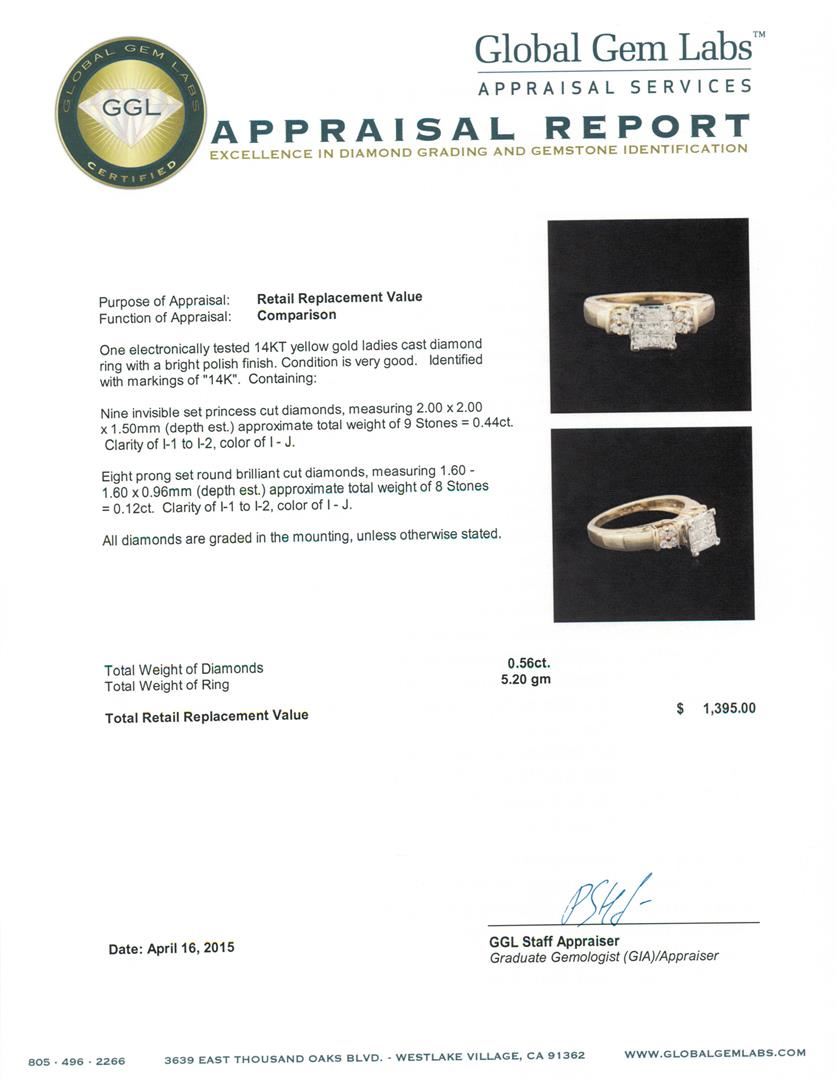 One electronically tested 14KT yellow gold ladies cast diamond ring with a bright polish finish. Identified with markings of "14K". Condition is very good. Containing: Nine invisible set princess cut diamonds, measuring 2.00 x 2.00 x 1.50mm (depth est.) approximate total weight of 9 Stones = 0.44ct. Clarity: I-1 to I-2. Color: I - J. Eight prong set round brilliant cut diamonds, measuring 1.60 - 1.60 x 0.96mm (depth est.) approximate total weight of 8 Stones = 0.12ct. Clarity: I-1 to I-2. Color: I - J. All diamonds are graded in the mounting, unless otherwise stated. Total Weight of Diamonds 0.56ct. Total Weight of Ring 5.20 grams. GGL Appraised at $1,395.00.