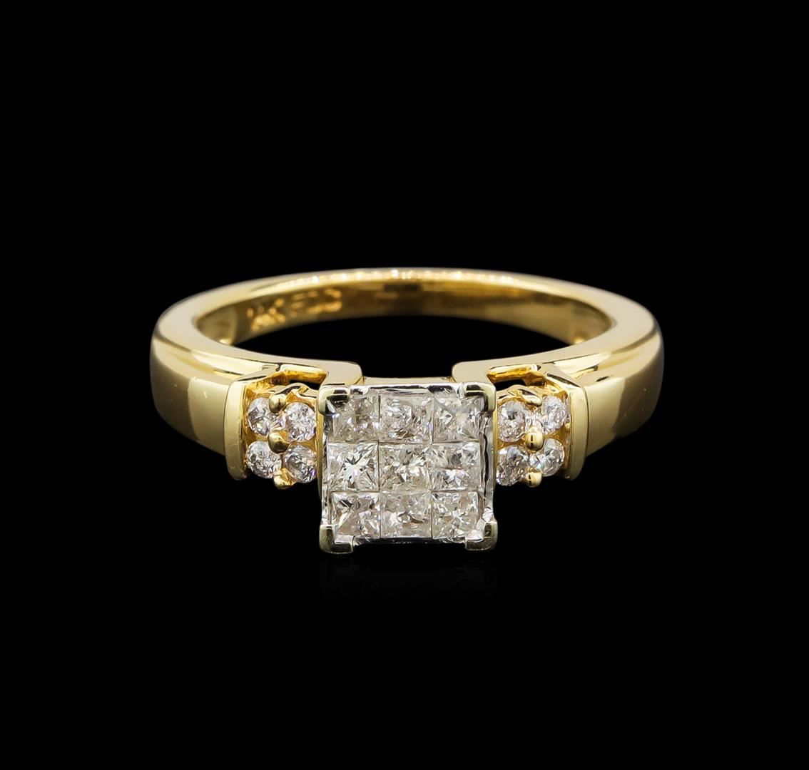 One electronically tested 14KT yellow gold ladies cast diamond ring with a bright polish finish. Identified with markings of "14K". Condition is very good. Containing: Nine invisible set princess cut diamonds, measuring 2.00 x 2.00 x 1.50mm (depth est.) approximate total weight of 9 Stones = 0.44ct. Clarity: I-1 to I-2. Color: I - J. Eight prong set round brilliant cut diamonds, measuring 1.60 - 1.60 x 0.96mm (depth est.) approximate total weight of 8 Stones = 0.12ct. Clarity: I-1 to I-2. Color: I - J. All diamonds are graded in the mounting, unless otherwise stated. Total Weight of Diamonds 0.56ct. Total Weight of Ring 5.20 grams. GGL Appraised at $1,395.00.