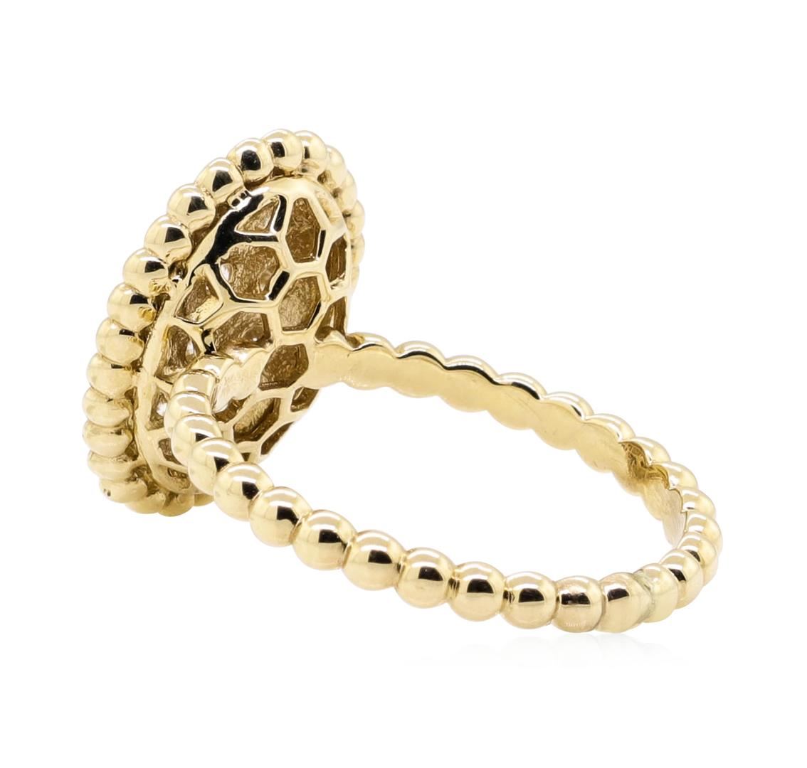 One electronically tested 14KT yellow gold Ladies cast fashion ring with a oval cluster with a bright polish finish. The featured Ladies ring has a rounded bead shank measuring 2.10 millimeters wide. Identified with markings of '14K'. Condition is new, good workmanship. Containing: Ten prong set round brilliant cut diamonds, measuring 2.50 - 2.40 x 1.52mm (depth est.) approximate total weight of 10 Stones = 0.56ct. Graded in the setting. Color G - H Clarity VS-2 to SI-1 Cut Very Good. Total Weight of Diamonds 0.56ct.. Total Weight of Ring 3.80gm. GAS Appraised.