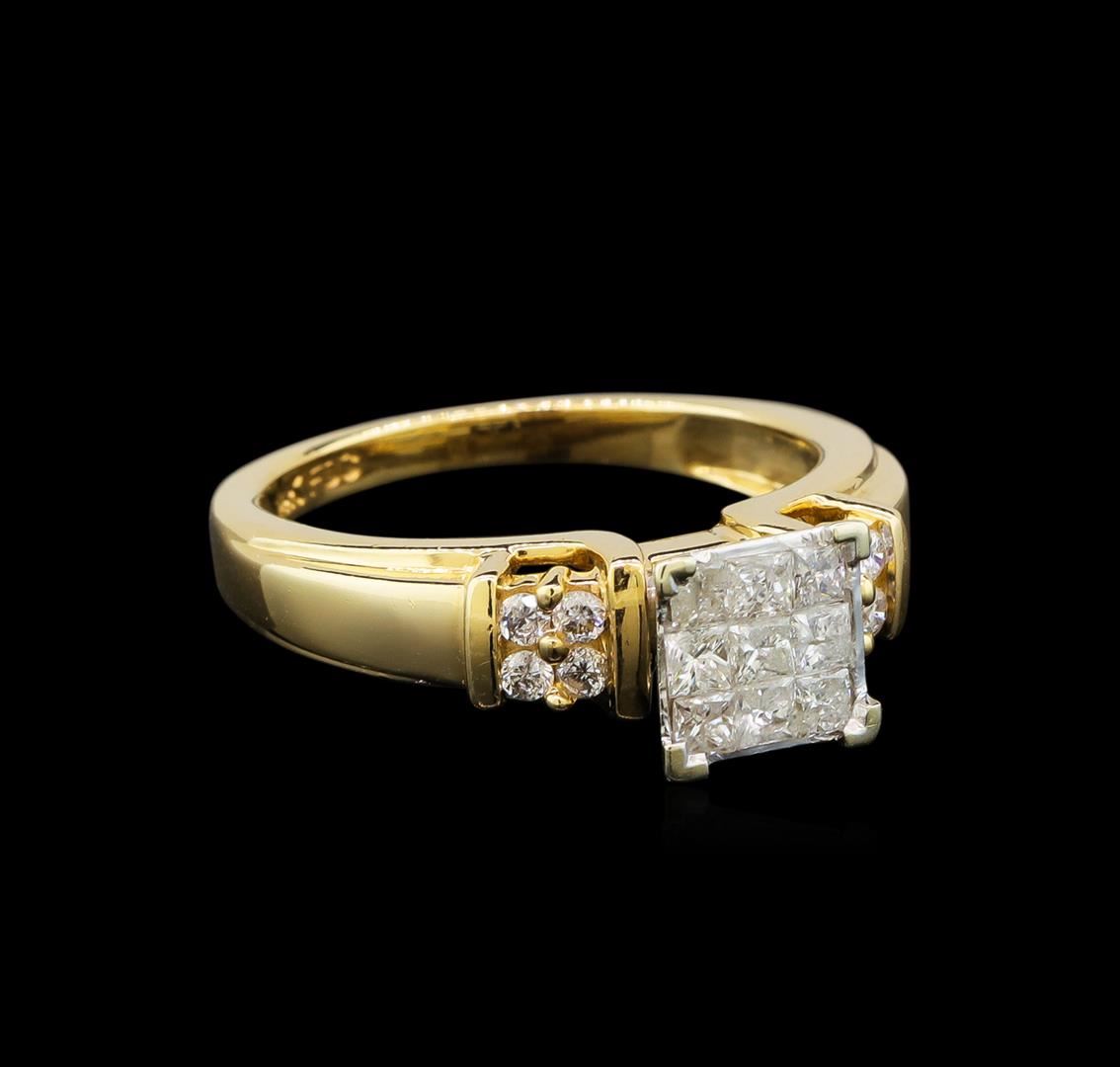 One electronically tested 14KT yellow gold ladies cast diamond ring with a bright polish finish. Identified with markings of "14K". Condition is very good. Containing: Nine invisible set princess cut diamonds, measuring 2.00 x 2.00 x 1.50mm (depth est.) approximate total weight of 9 Stones = 0.44ct. Clarity: I-1 to I-2. Color: I - J. Eight prong set round brilliant cut diamonds, measuring 1.60 - 1.60 x 0.96mm (depth est.) approximate total weight of 8 Stones = 0.12ct. Clarity: I-1 to I-2. Color: I - J. All diamonds are graded in the mounting, unless otherwise stated. Total Weight of Diamonds 0.56ct. Total Weight of Ring 5.20 grams. GGL Appraised at $1,395.00.