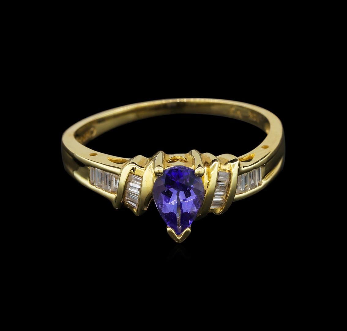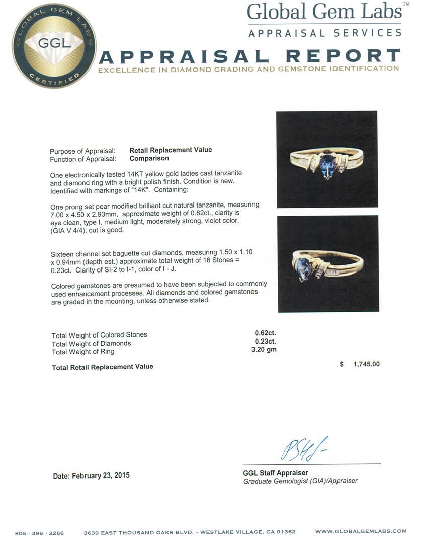 One electronically tested 14KT yellow gold ladies cast tanzanite and diamond ring with a bright polish finish. Identified with markings of "14K". Condition is new. Containing: One prong set pear modified brilliant cut natural tanzanite, measuring 7.00 x 4.50 x 2.93mm, approximate weight of 0.62ct., clarity is eye clean, type I, medium light, moderately strong, violet color, (GIA V 4/4), cut is good. Sixteen channel set baguette cut diamonds, measuring 1.50 x 1.10 x 0.94mm (depth est.) approximate total weight of 16 Stones = 0.23ct. Clarity: SI-2 to I-1. Color: I - J. Colored gemstones are presumed to have been subjected to commonly used enhancement processes. All diamonds and colored gemstones are graded in the mounting, unless otherwise stated. Total Weight of Colored Stones 0.62ct. Total Weight of Diamonds 0.23ct. Total Weight of Ring 3.20 grams. GGL Appraised at $1,745.00.