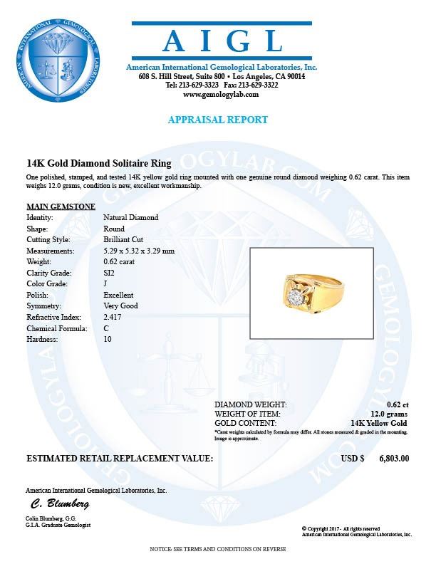 One 14KT Yellow Gold 0.62ct Diamond Ring. (1) Diamond with a total weight of 0.62cts with a color of J and clarity of SI-2. Total weight of 12 grams.