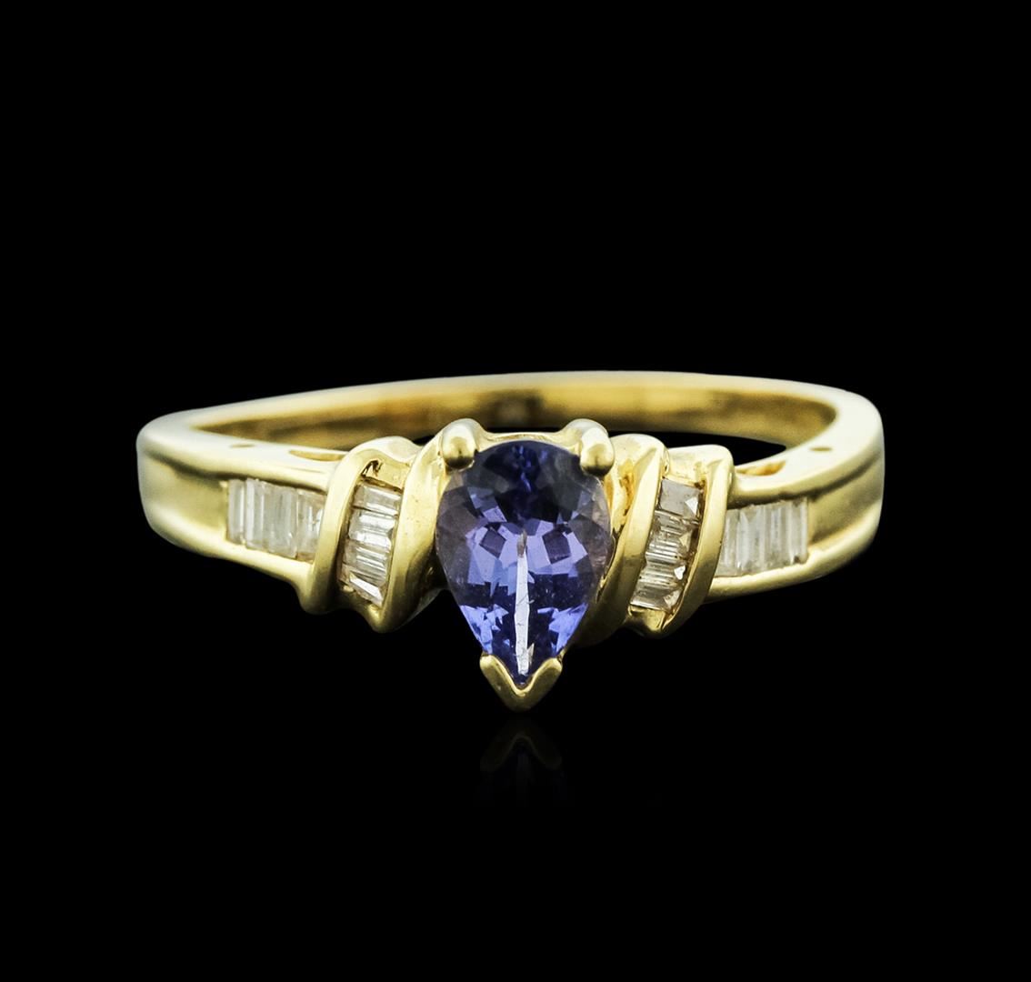 One electronically tested 14KT yellow gold ladies cast tanzanite and diamond ring with a bright polish finish. Identified with markings of "14K". Condition is new. Containing: One prong set pear modified brilliant cut natural tanzanite, measuring 7.00 x 4.50 x 2.93mm, approximate weight of 0.62ct., clarity is eye clean, type I, medium light, moderately strong, violet color, (GIA V 4/4), cut is good. Sixteen channel set baguette cut diamonds, measuring 1.50 x 1.10 x 0.94mm (depth est.) approximate total weight of 16 Stones = 0.23ct. Clarity: SI-2 to I-1. Color: I - J. Colored gemstones are presumed to have been subjected to commonly used enhancement processes. All diamonds and colored gemstones are graded in the mounting, unless otherwise stated. Total Weight of Colored Stones 0.62ct. Total Weight of Diamonds 0.23ct. Total Weight of Ring 3.20 grams. GGL Appraised at $1,745.00.