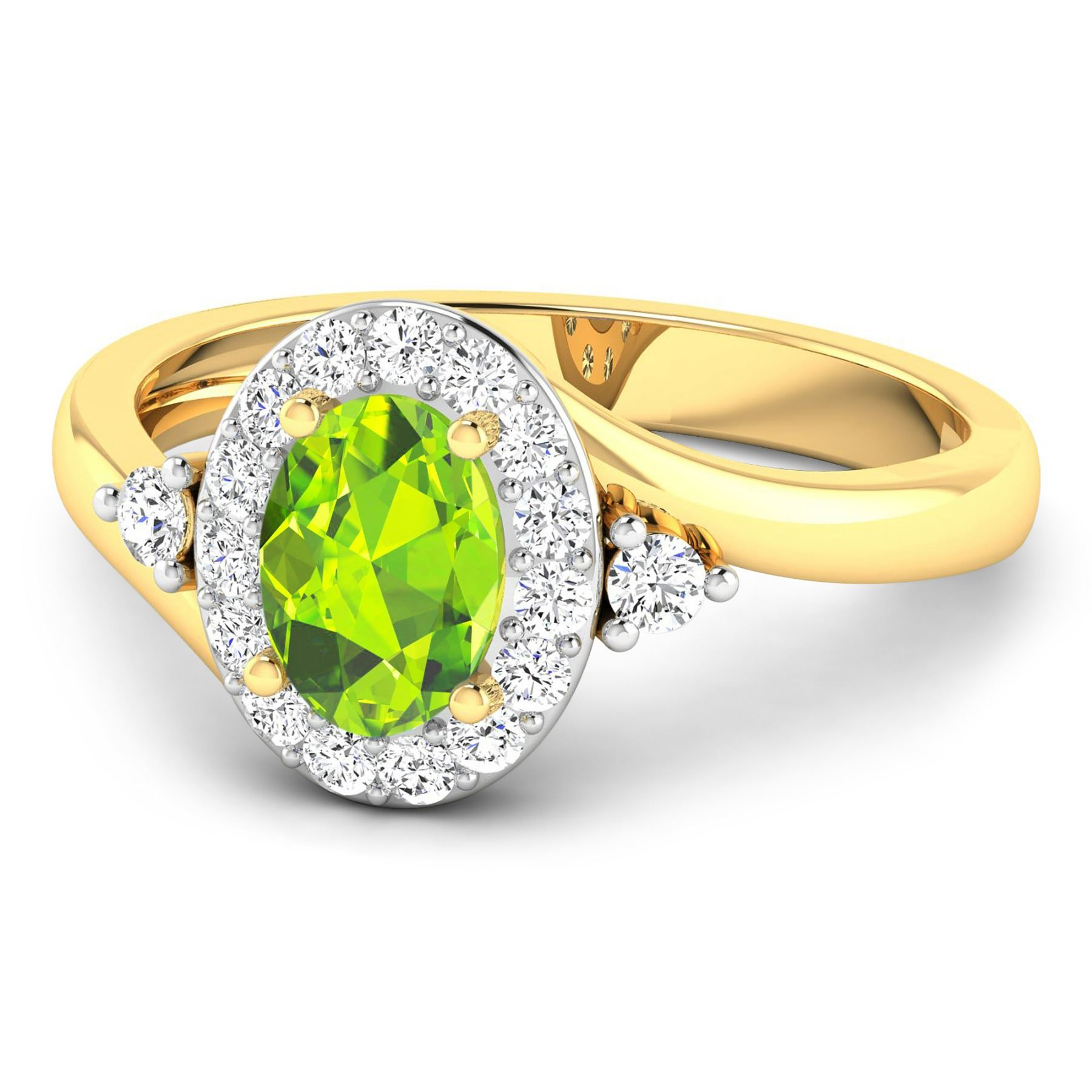 Peridot Oval 7x5mm - 1Pc + White Diamond F/C Round 2.00mm - 2Pcs + White Diamond F/C Round 1.50mm - 15Pcs ( White Pan Rhodium ) ( I1-I2/I color ) Total weight of gemstone is 0.63cts. Total Diamond weight is 0.27cts. Total weight of this ring is 2.69 grams. Ring size 7.