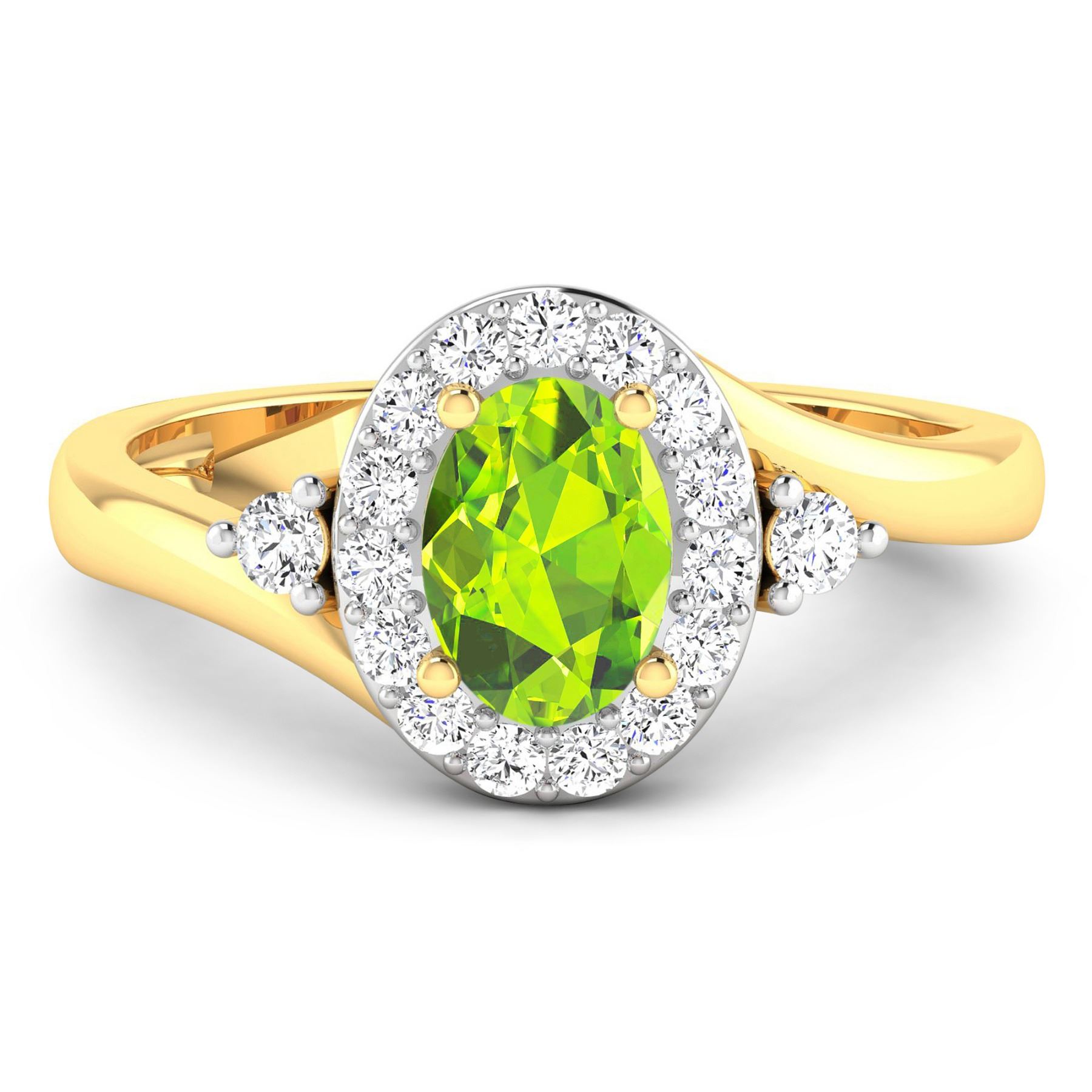 Peridot Oval 7x5mm - 1Pc + White Diamond F/C Round 2.00mm - 2Pcs + White Diamond F/C Round 1.50mm - 15Pcs ( White Pan Rhodium ) ( I1-I2/I color ) Total weight of gemstone is 0.63cts. Total Diamond weight is 0.27cts. Total weight of this ring is 2.69 grams. Ring size 7.