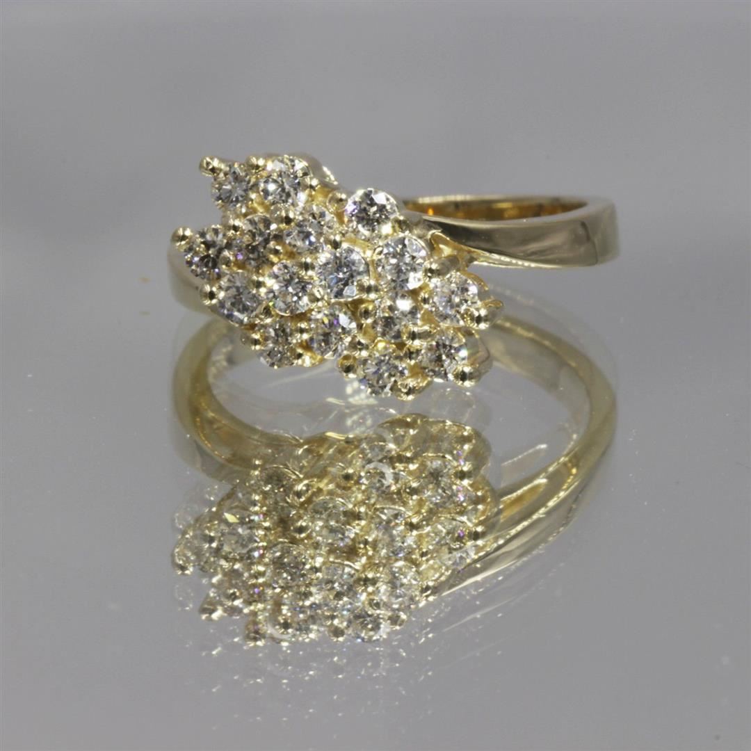 One Lady's Cluster Diamond Ring in 14k Yellow Gold. The total stone weight is 0.64 carats, color G-H, and clarity VS2-SI1. Gross weight is 3.88 grams. Condition is brand new. Ring size is 5.50. Total amount of stones are 16.