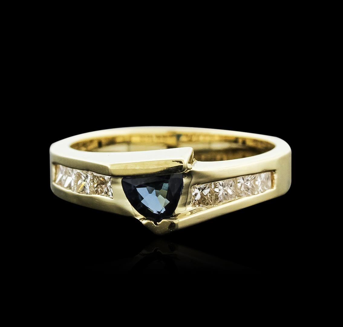 One ring featuring: 14KT yellow gold weighing 4.39 grams containing one triangle cut sapphire weighing 0.65ct and princess cut diamonds weighing a total of 0.63ct.