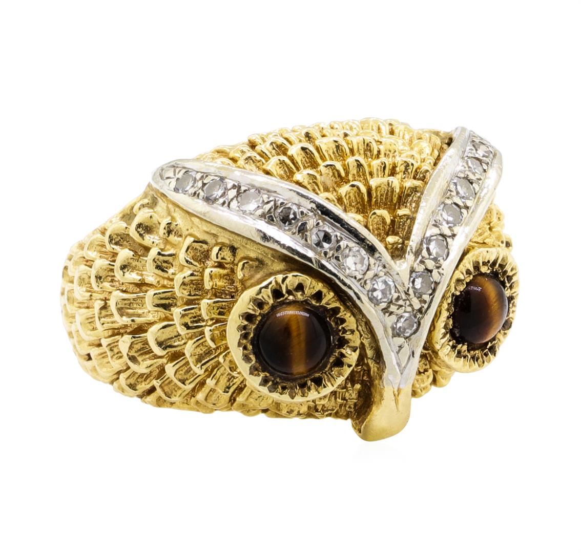 14KT Yellow Gold 0.65 ctw Tiger's Eye and Diamond Owl Motif Ring