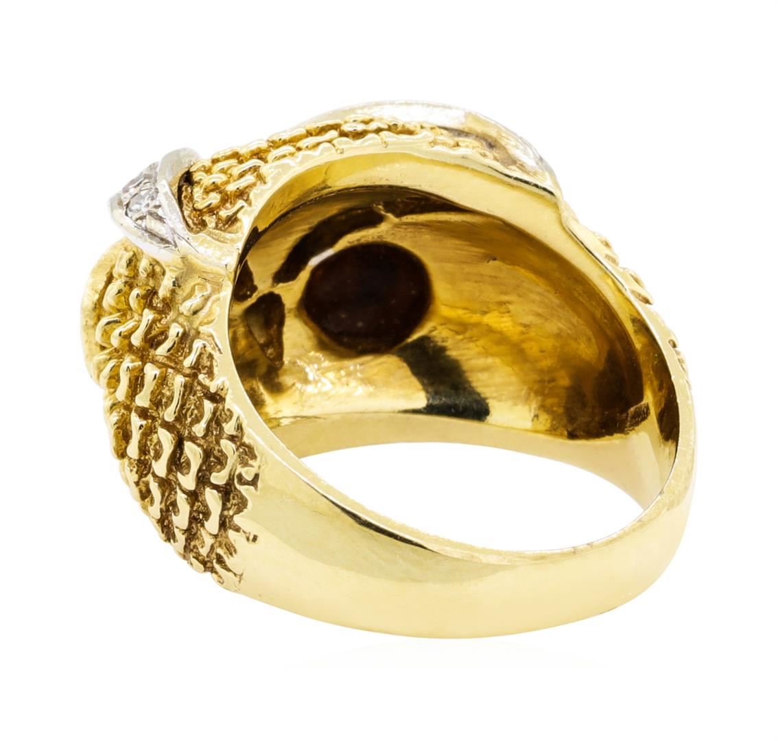 One ring featuring: 14KT yellow gold weighing 13.1 grams containing tiger's eye weighing 0.50ctw and diamonds weighing 0.15ctw. The ring is a size 7.