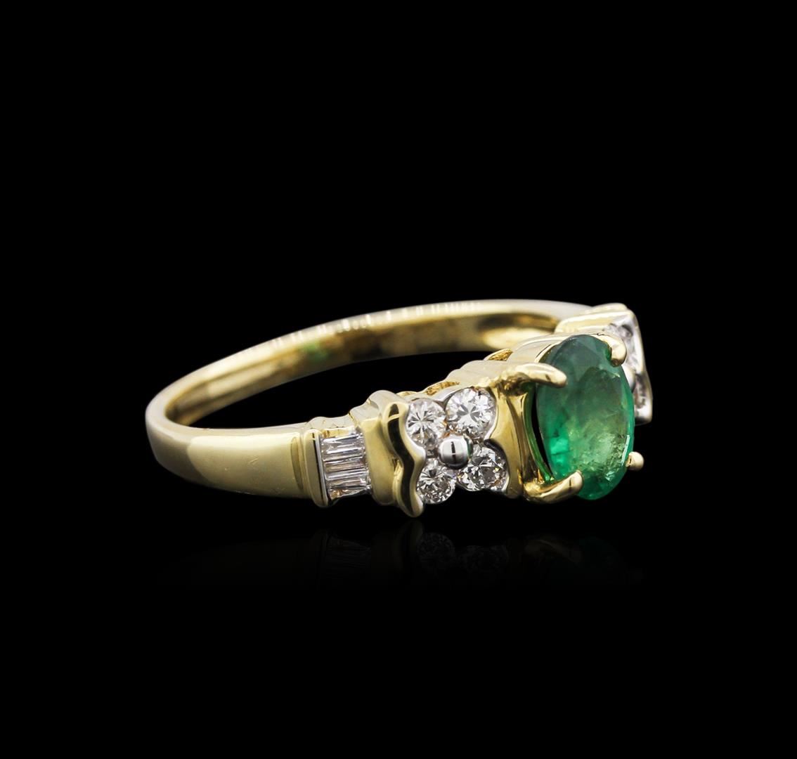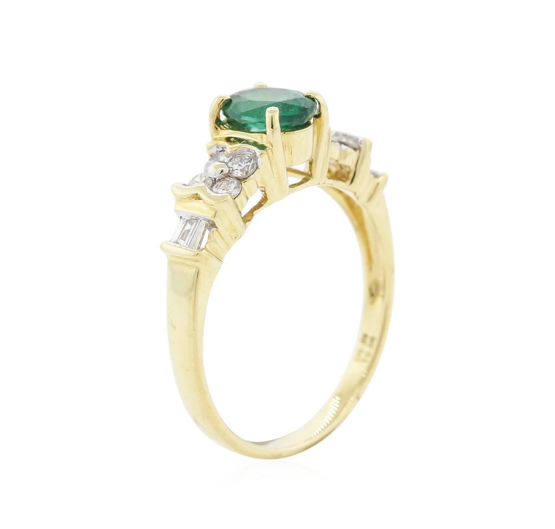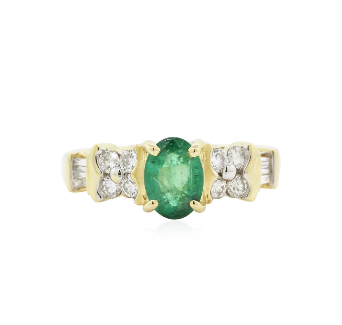 One ring featuring: 14KT yellow gold weighing 3.10 grams containing one emerald center stone with a total weight of 0.65ct and 14 baguette and round diamonds with a total weight of 0.35ct.