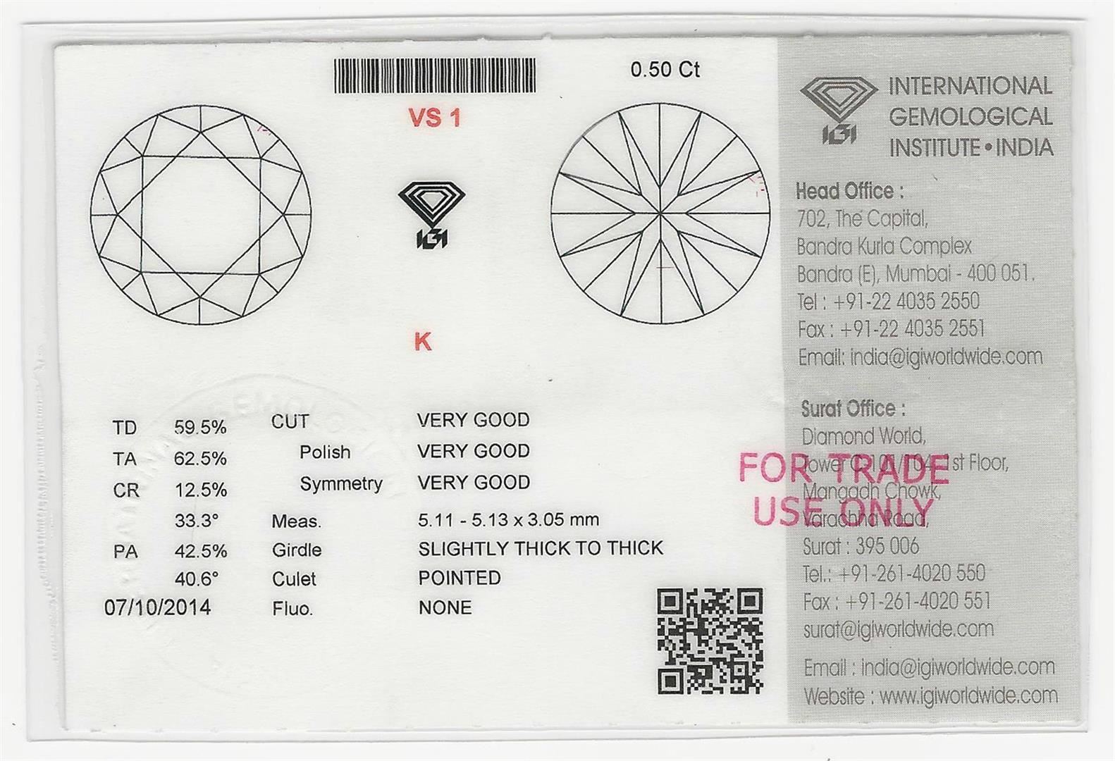 One 14KT Yellow Gold 0.66ctw Diamond Ring with a total weight of 3.2 grams. Center Diamond weight is 0.50cts with a color of (K) and clarity of (VS-1). (2) round diamonds with a total weight of 0.16cts. IGI Appraised.