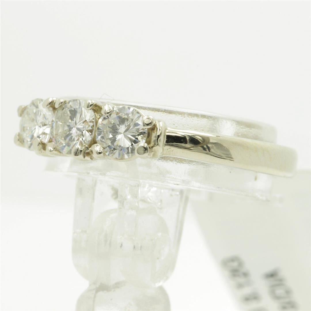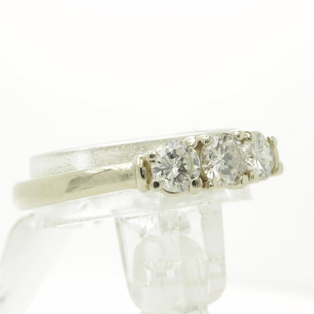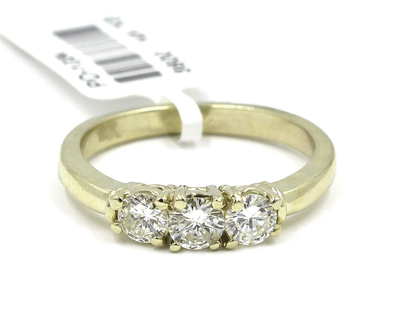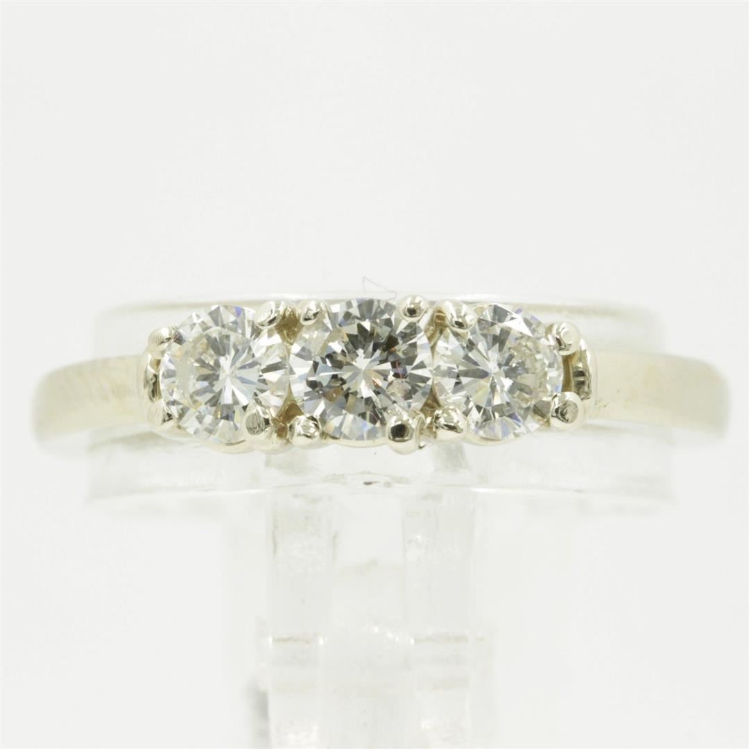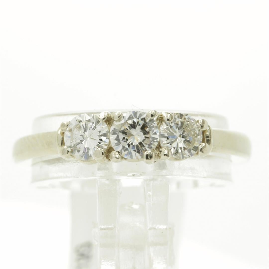 One Round Cut Three-Stone Diamond Engagement Band Ring. The setting style is a three stone design. Made with 14k white gold. Gross weight is 3.12 grams with a total of 3 stones. Size 6 but is resizable. Condition is brand new. Main stone is non-enhanced and natural. Main diamond is 0.66 carats, shape brilliant round cut, clarity SI-1, color H-1, and cut is very good.
