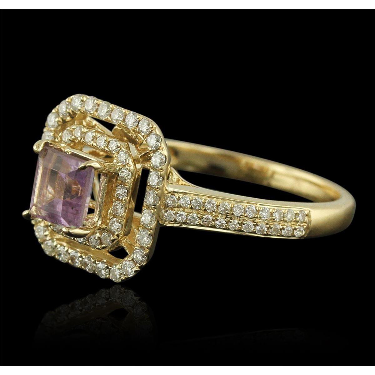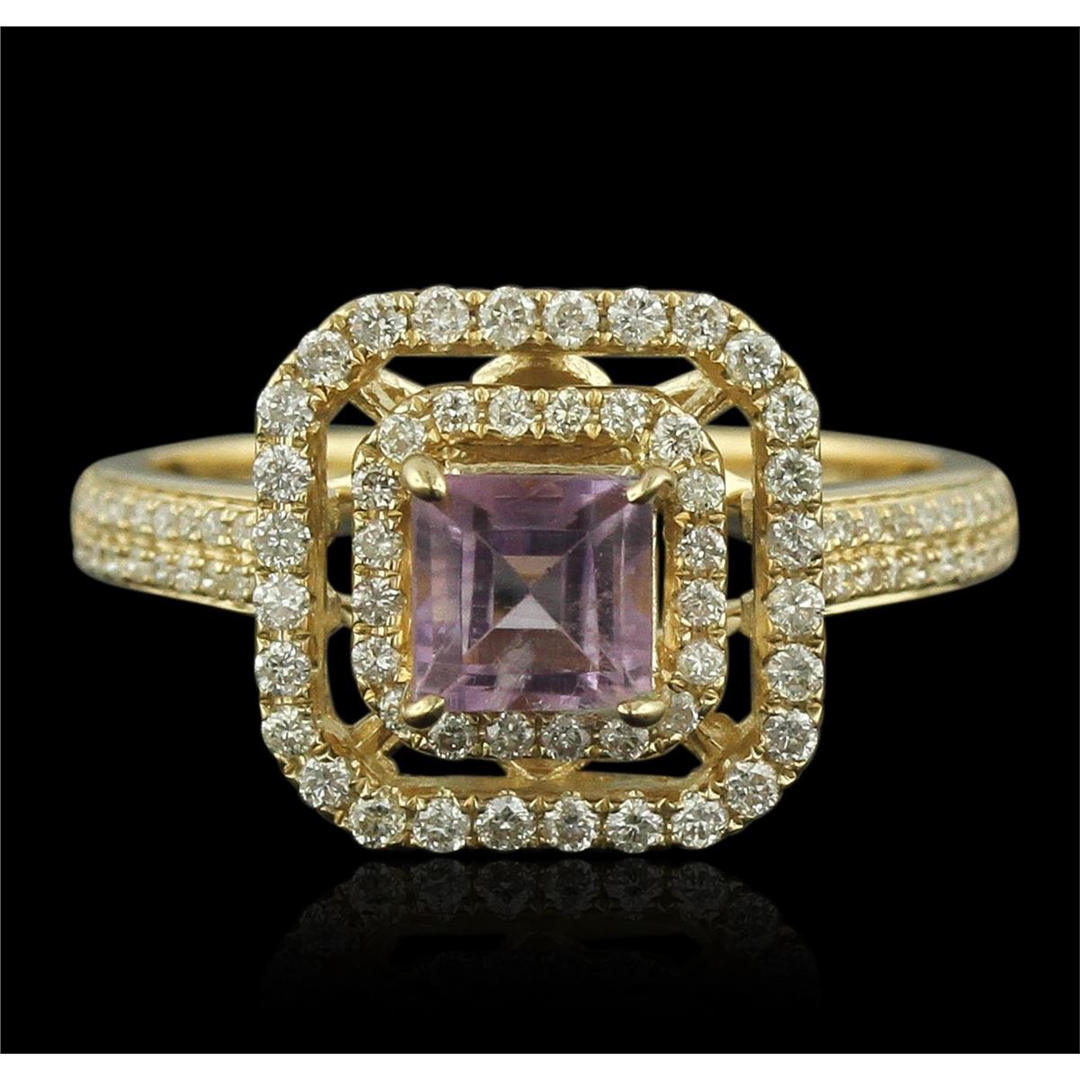 One electronically tested 14KT yellow gold Ladies combination cast & assembled ring with a bright polish finish. Condition is new. Identified with markings of "14K". Containing: Forty-Four prong set round brilliant cut diamonds, measuring 0.06 - 0.06 x 0.04mm (depth est.) approximate. Total Weight of 44 Stones = 0.20ct. Clarity: I-1 to I-2. Color: I - J, Cut is Good. Twenty-Eight prong set round brilliant cut diamonds, measuring 1.10 - 1.10 x 0.66mm (depth est.) approximate. Total Weight of 28 Stones = 0.27ct. Clarity: I-1 to I-2. Color: I - J, Cut is Good. Twenty prong set round brilliant cut diamonds, measuring 0.90 - 0.90 x 0.54mm (depth est.) approximate. Total Weight of 20 Stones = 0.05ct. Clarity: I-1 to I-2. Color: I - J, Cut is Good. One prong set square standard step cut natural amethyst, measuring 5.00 x 5.00 x 3.25mm, approximate weight of 0.67ct., clarity is eye clean, type II, light, very slightly grayish, purple color, (GIA P 3/3), cut is very good. Colored gemstones are presumed to have been subjected to commonly used color/clarity enhancement processes. Total Weight of Colored Stones 0.67ct. Total Weight of Diamonds 0.52ct. Total Weight of Ring 3.60 grams. GGL Appraised at $2,805.00.