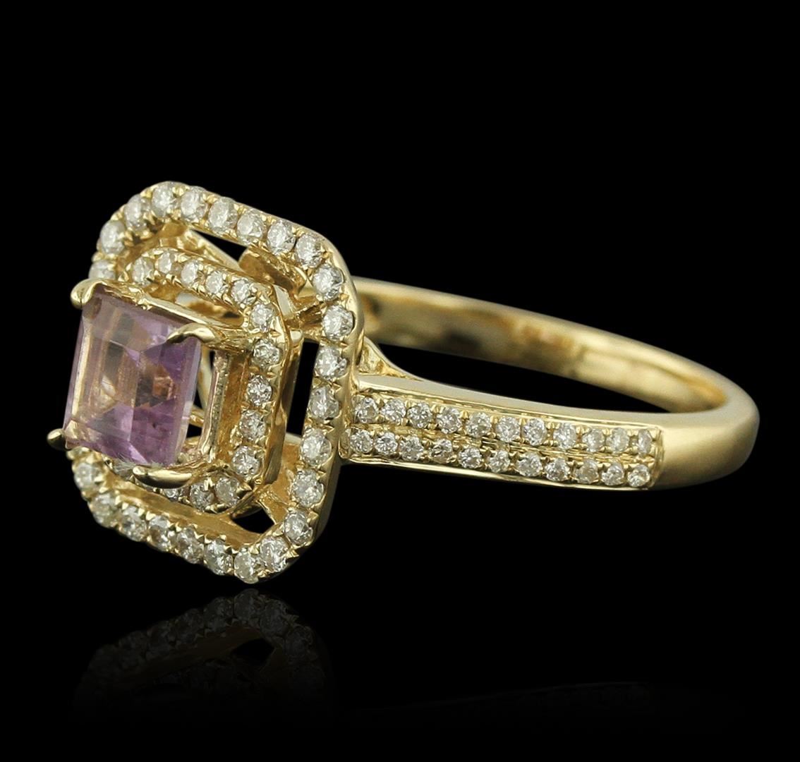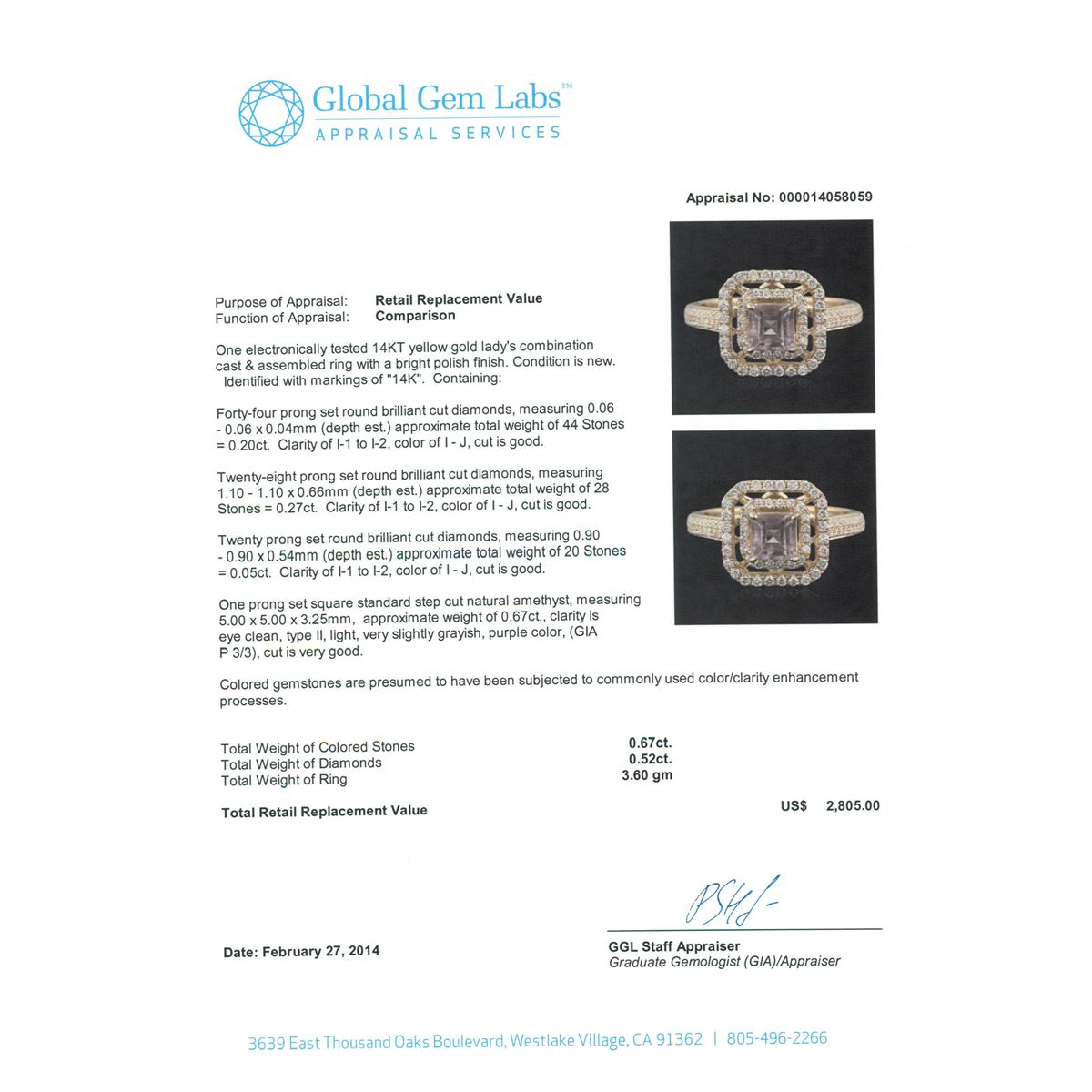 One electronically tested 14KT yellow gold Ladies combination cast & assembled ring with a bright polish finish. Condition is new. Identified with markings of "14K". Containing: Forty-Four prong set round brilliant cut diamonds, measuring 0.06 - 0.06 x 0.04mm (depth est.) approximate. Total Weight of 44 Stones = 0.20ct. Clarity: I-1 to I-2. Color: I - J, Cut is Good. Twenty-Eight prong set round brilliant cut diamonds, measuring 1.10 - 1.10 x 0.66mm (depth est.) approximate. Total Weight of 28 Stones = 0.27ct. Clarity: I-1 to I-2. Color: I - J, Cut is Good. Twenty prong set round brilliant cut diamonds, measuring 0.90 - 0.90 x 0.54mm (depth est.) approximate. Total Weight of 20 Stones = 0.05ct. Clarity: I-1 to I-2. Color: I - J, Cut is Good. One prong set square standard step cut natural amethyst, measuring 5.00 x 5.00 x 3.25mm, approximate weight of 0.67ct., clarity is eye clean, type II, light, very slightly grayish, purple color, (GIA P 3/3), cut is very good. Colored gemstones are presumed to have been subjected to commonly used color/clarity enhancement processes. Total Weight of Colored Stones 0.67ct. Total Weight of Diamonds 0.52ct. Total Weight of Ring 3.60 grams. GGL Appraised at $2,805.00.