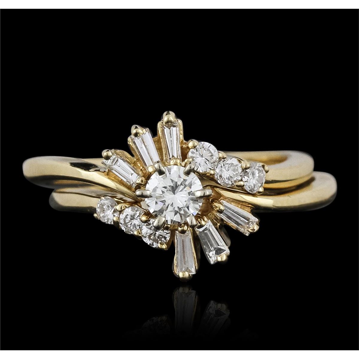 One electronically tested 14KT yellow gold ladies cast & assembled diamond wedding set. The wedding set includes a diamond engagement ring and a diamond wedding band. The engagement ring features a diamond set within a series of round and baguette diamonds. The set is completed by a matching diamond wedding band. Each ring is completed by a one and one-half millimeter wide band. Identified with markings of "14K". Condition is new, good workmanship. Containing: One prong set round brilliant cut diamond, measuring 3.85 - 3.80 x 2.30mm (depth est.) approximate weight of 0.30ct with a medium blue fluorescence. Graded in the setting. Clarity: SI-1. Color: J. Depth 60.1%. Table 70.5%. Six prong set round brilliant cut diamonds, measuring 2.10 - 2.00 x 1.23mm (depth est.) approximate total weight of 6 Stones = 0.25ct. Graded in the setting. Clarity: SI-1 to SI-2. Color: G - I Six prong set baguette cut (tapered) diamonds, measuring from 2.90 x 1.00 x 0.70mm (depth est.) to 3.20 x 1.20 x 0.84mm (depth est.) approximate total weight of 6 Stones = 0.14ct. Graded in the setting. Clarity: VVS-2 to VS-2. Color: G - I. Total Weight of Diamonds 0.69ct. Total Weight of Wedding Set 4.72 grams. AIG Appraised at $4,440.00.