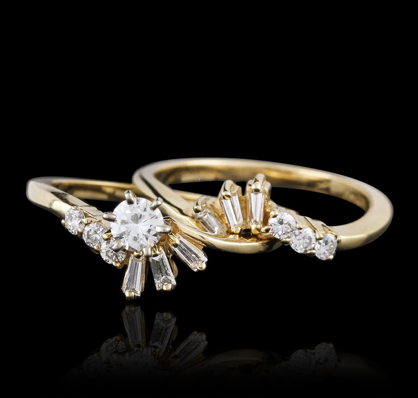 One electronically tested 14KT yellow gold ladies cast & assembled diamond wedding set. The wedding set includes a diamond engagement ring and a diamond wedding band. The engagement ring features a diamond set within a series of round and baguette diamonds. The set is completed by a matching diamond wedding band. Each ring is completed by a one and one-half millimeter wide band. Identified with markings of "14K". Condition is new, good workmanship. Containing: One prong set round brilliant cut diamond, measuring 3.85 - 3.80 x 2.30mm (depth est.) approximate weight of 0.30ct with a medium blue fluorescence. Graded in the setting. Clarity: SI-1. Color: J. Depth 60.1%. Table 70.5%. Six prong set round brilliant cut diamonds, measuring 2.10 - 2.00 x 1.23mm (depth est.) approximate total weight of 6 Stones = 0.25ct. Graded in the setting. Clarity: SI-1 to SI-2. Color: G - I Six prong set baguette cut (tapered) diamonds, measuring from 2.90 x 1.00 x 0.70mm (depth est.) to 3.20 x 1.20 x 0.84mm (depth est.) approximate total weight of 6 Stones = 0.14ct. Graded in the setting. Clarity: VVS-2 to VS-2. Color: G - I. Total Weight of Diamonds 0.69ct. Total Weight of Wedding Set 4.72 grams. AIG Appraised at $4,440.00.