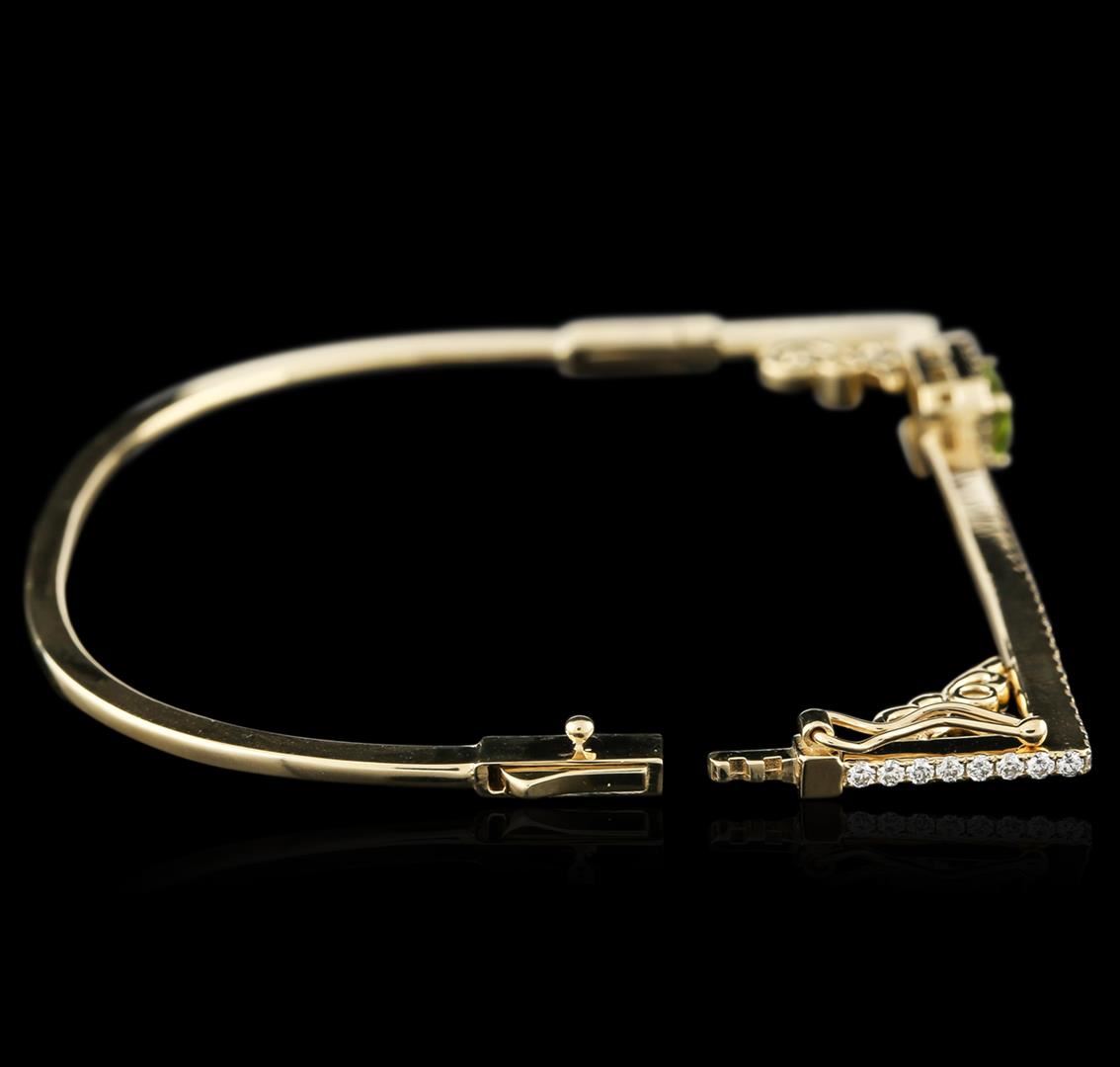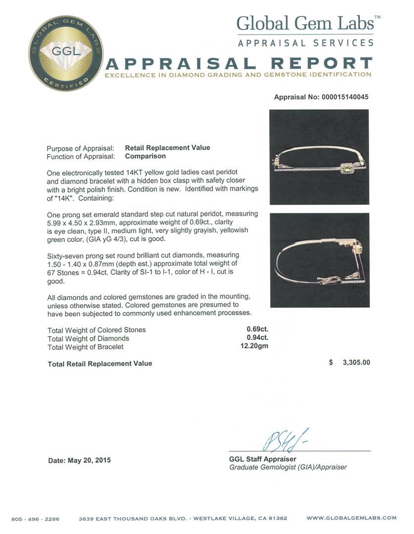 One electronically tested 14KT yellow gold ladies cast peridot and diamond bracelet with a hidden box clasp with safety closer with a bright polish finish. Identified with markings of "14K". Condition is new. Containing: One prong set emerald standard step cut natural peridot, measuring 5.99 x 4.50 x 2.93mm, approximate weight of 0.69ct., clarity is eye clean, type II, medium light, very slightly grayish, yellowish green color, (GIA yG 4/3), cut is good. Sixty-Seven prong set round brilliant cut diamonds, measuring 1.50 - 1.40 x 0.87mm (depth est.) approximate total weight of 67 Stones = 0.94ct. Clarity: SI-1 to I-1. Color: H - I, Cut is Good. All diamonds and colored gemstones are graded in the mounting, unless otherwise stated. Colored gemstones are presumed to have been subjected to commonly used enhancement processes. Total Weight of Colored Stones 0.69ct. Total Weight of Diamonds 0.94ct. Total Weight of Bracelet 12.20 grams. GGL Appraised at $3,305.00.