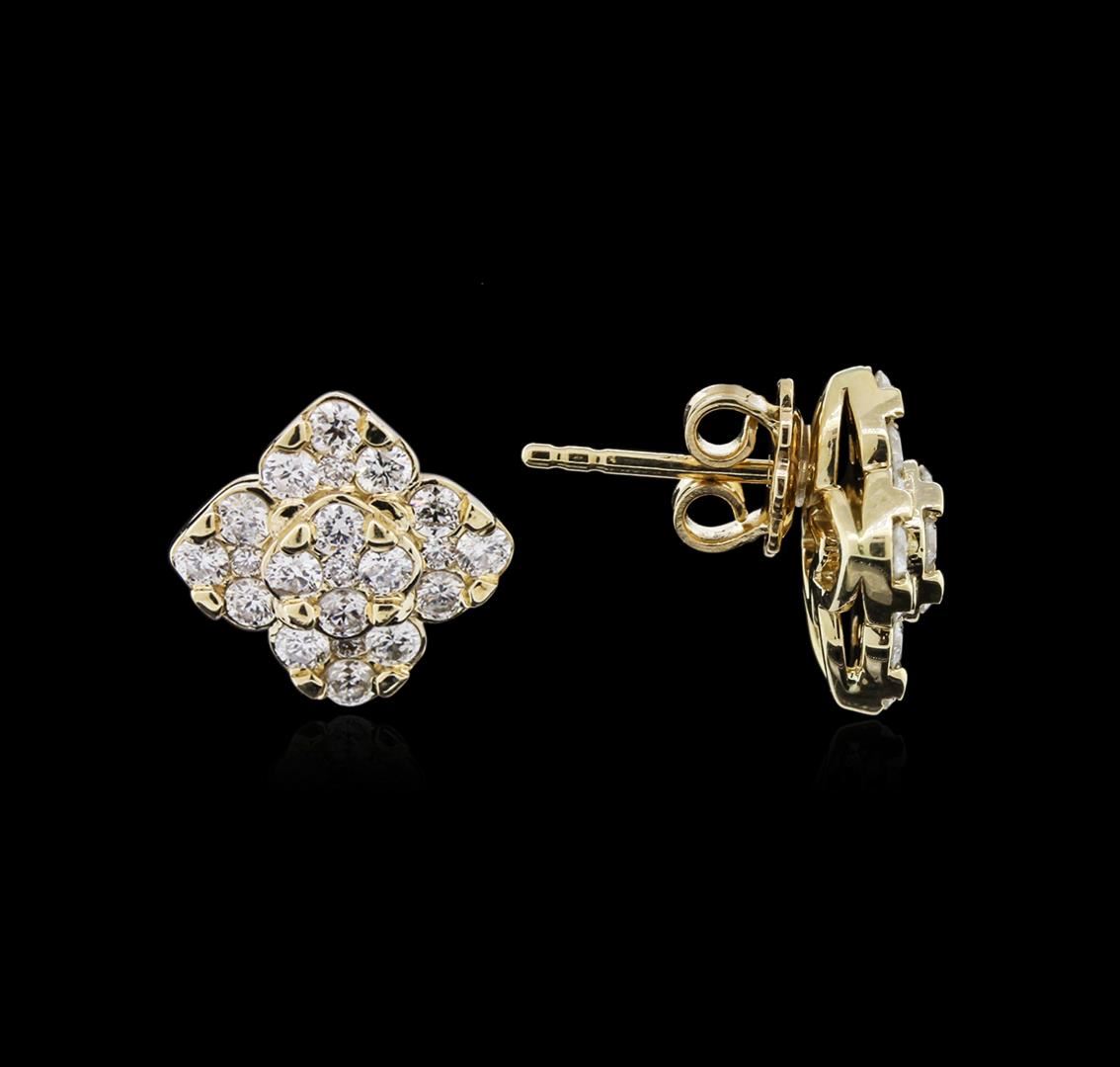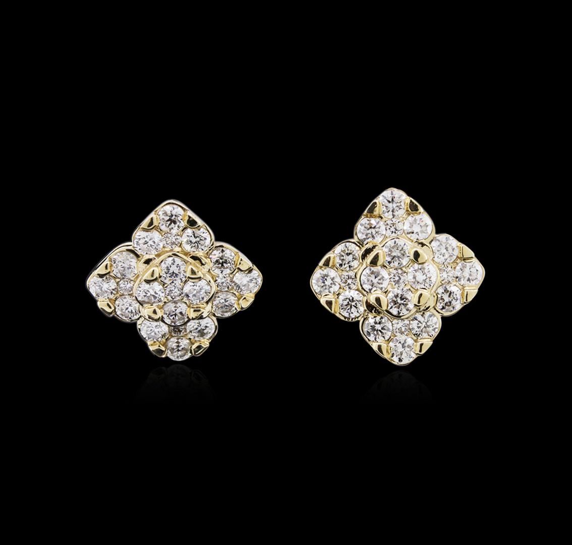 One pair electronically tested 14KT yellow gold ladies cast diamond stud earrings with friction posts with a bright polish finish. Identified with markings of "585". Condition is new. Containing: Thirty-Four prong set round brilliant cut diamonds, measuring 2.10 - 1.30 x 1.02mm (depth est.) approximate total weight of 34 Stones = 0.70ct. Clarity: SI-1 to I-1. Color: I - J, Cut is Good. Diamonds are graded in the mounting, unless otherwise stated. Total Weight of Diamonds 0.70ct. Total Weight of Earrings 5.70 grams. GGL Appraised at $1,995.00.