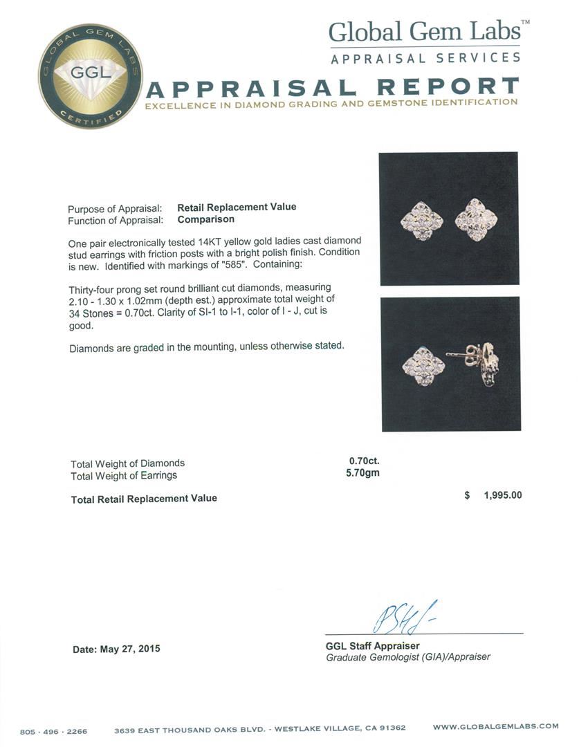 One pair electronically tested 14KT yellow gold ladies cast diamond stud earrings with friction posts with a bright polish finish. Identified with markings of "585". Condition is new. Containing: Thirty-Four prong set round brilliant cut diamonds, measuring 2.10 - 1.30 x 1.02mm (depth est.) approximate total weight of 34 Stones = 0.70ct. Clarity: SI-1 to I-1. Color: I - J, Cut is Good. Diamonds are graded in the mounting, unless otherwise stated. Total Weight of Diamonds 0.70ct. Total Weight of Earrings 5.70 grams. GGL Appraised at $1,995.00.